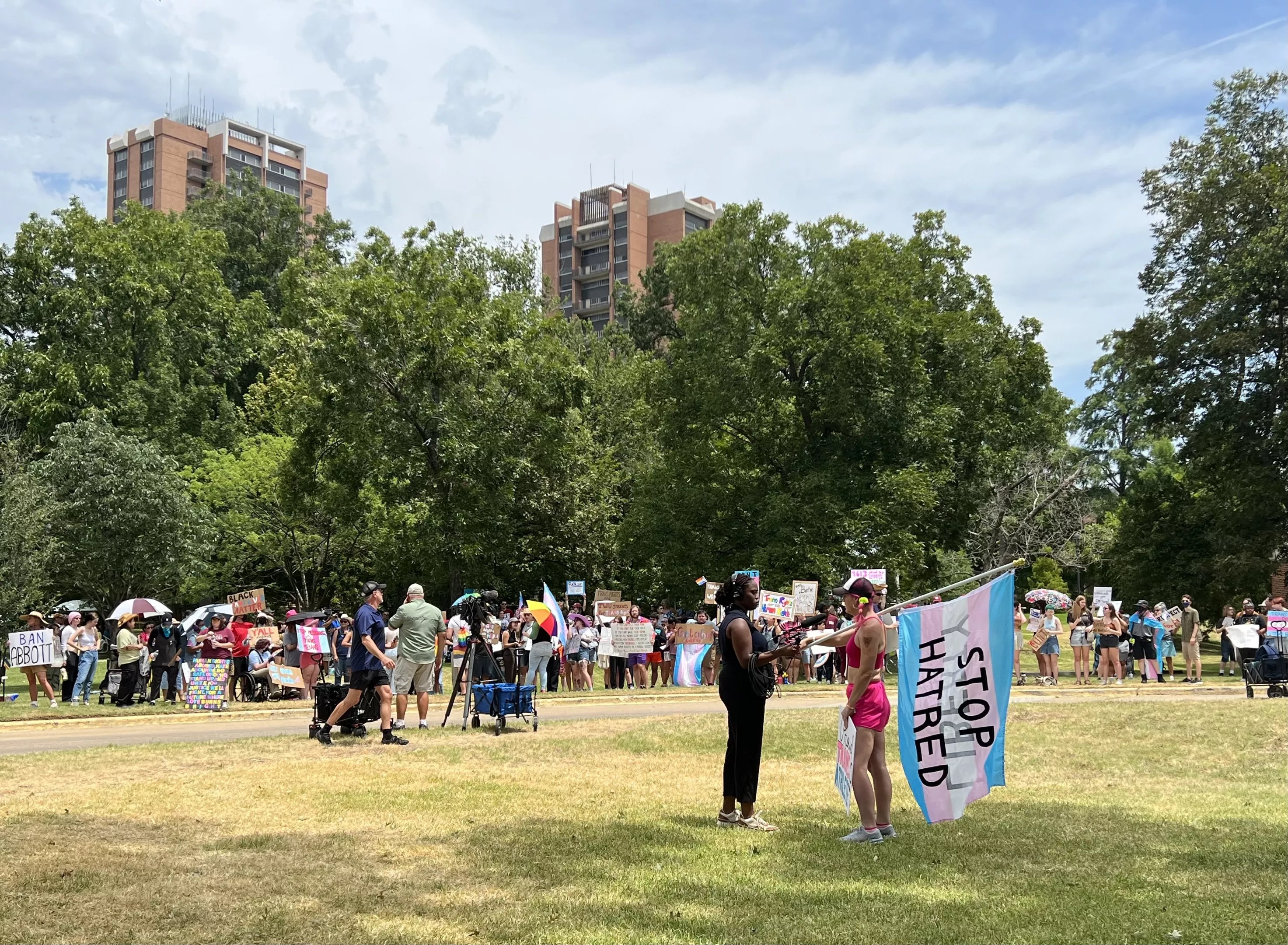 Chanting could be heard blocks away from the protest on an otherwise still Monday afternoon at Texas Woman’s University in Denton. “Transphobia has got to go,” the demonstrators yelled as the temperature approached triple digits.