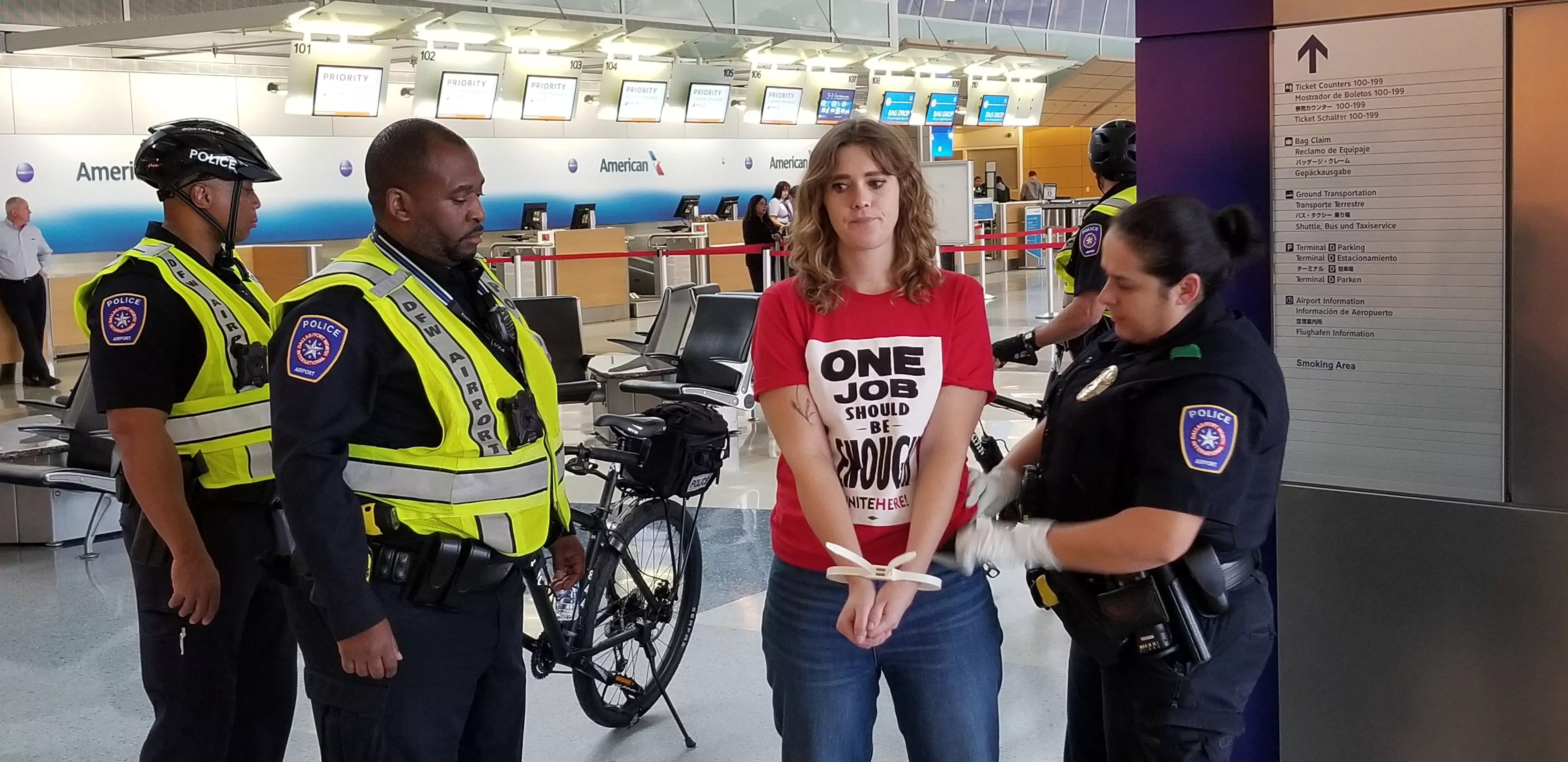 DFW Airport police arrest Kara Sheehan, an activist with the union rights organization Jobs with Justice, during a demonstration Tuesday afternoon.