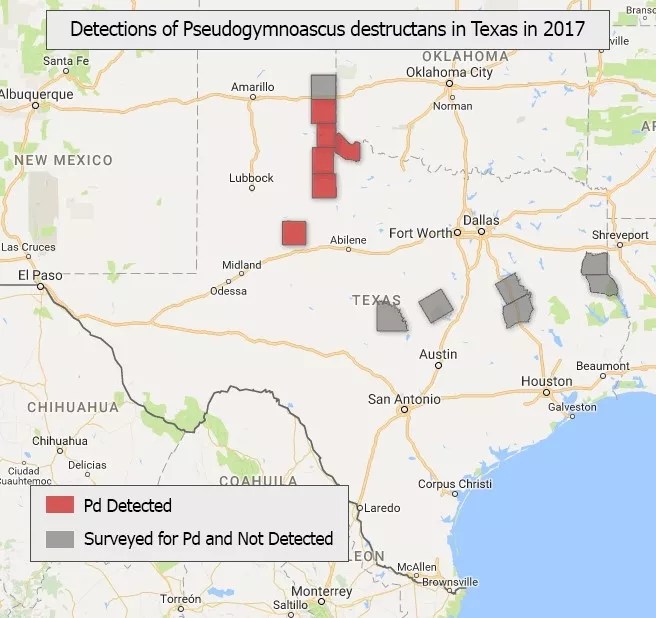 Still, the fungus’ arrival in Texas is a worrying sign, Meierhofer says, since Texas is a crossroads for a variety of bat species. Its arrival here puts the fungus within 200 miles of New Mexico, offering a potential inroad for the disease to spread to states to the west that so far have been spared.