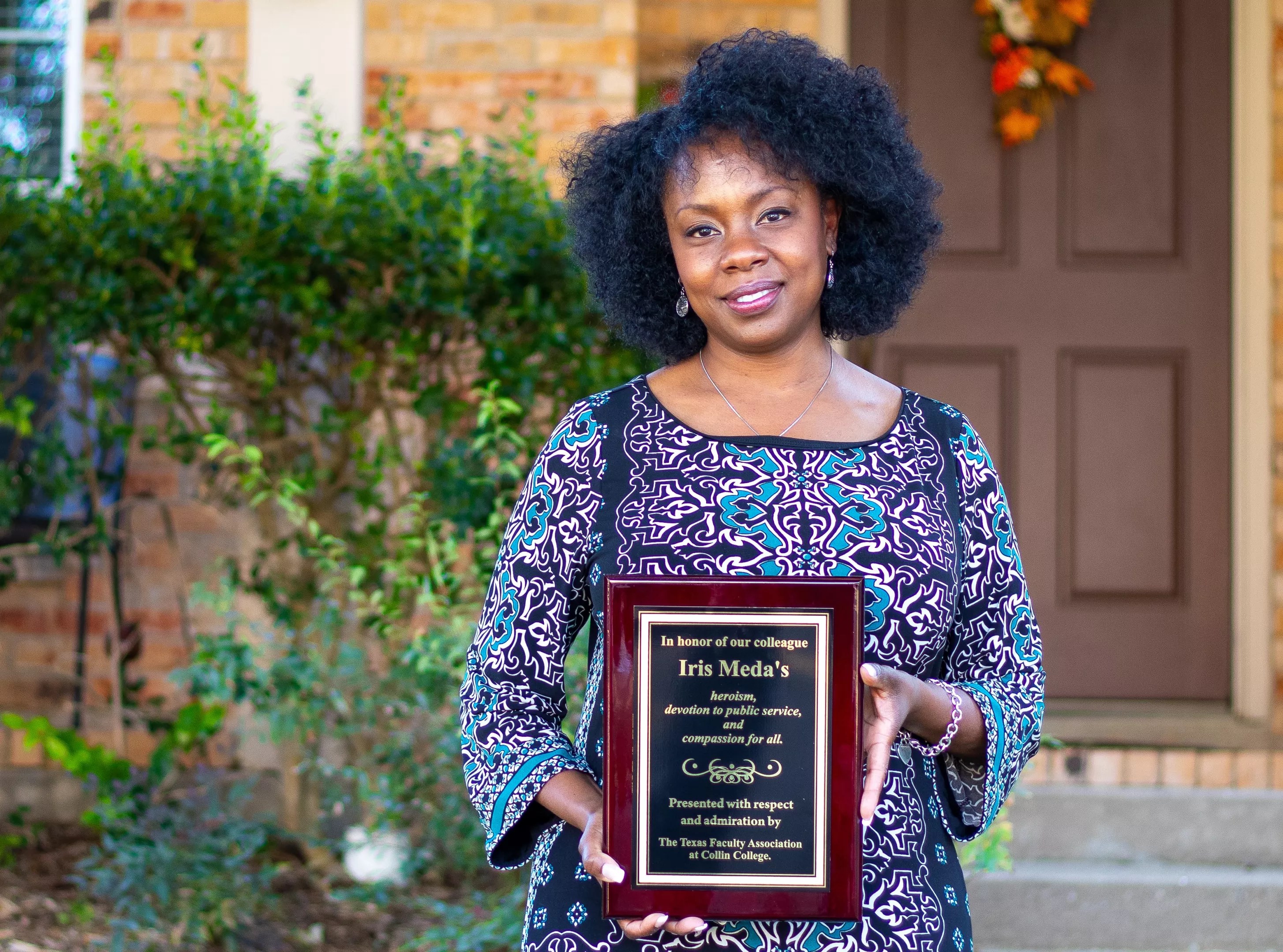 It’s been a challenging year for the family of Iris Meda, a Collin College nursing professor who died of COVID-19 last November. But smiling through tears on a brilliant autumn afternoon, her daughter accepted a plaque honoring Meda’s service.