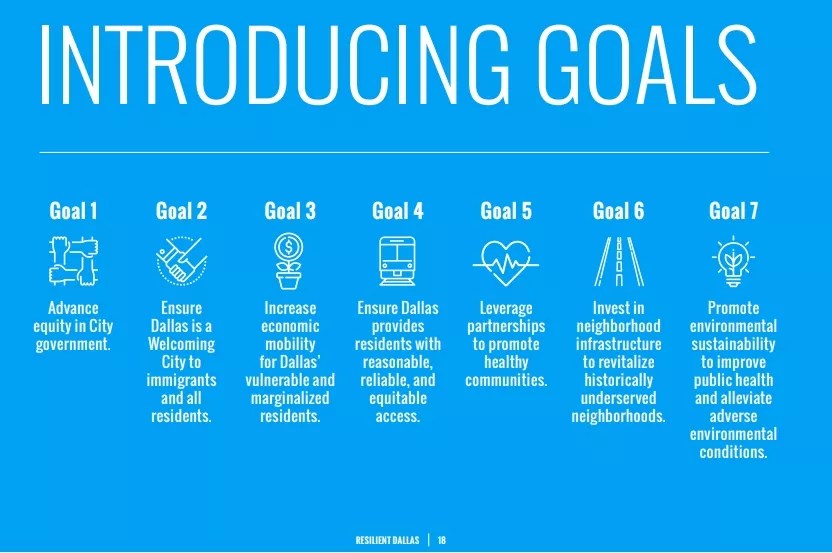 The groundwork by the Resilient Dallas team identified seven main goals to improve the deficiencies and a host of actions to reach them. But Dallas has a history of creating grand plans and a less than stellar record of having them bear fruit. At the meeting Resilient Dallas was unveiled, council members Philip Kingston and Mark Clayton wanted to know which actions are underway now. The voluminous plan and its some 30 multi-pronged initiatives appeared to be overwhelming the council.