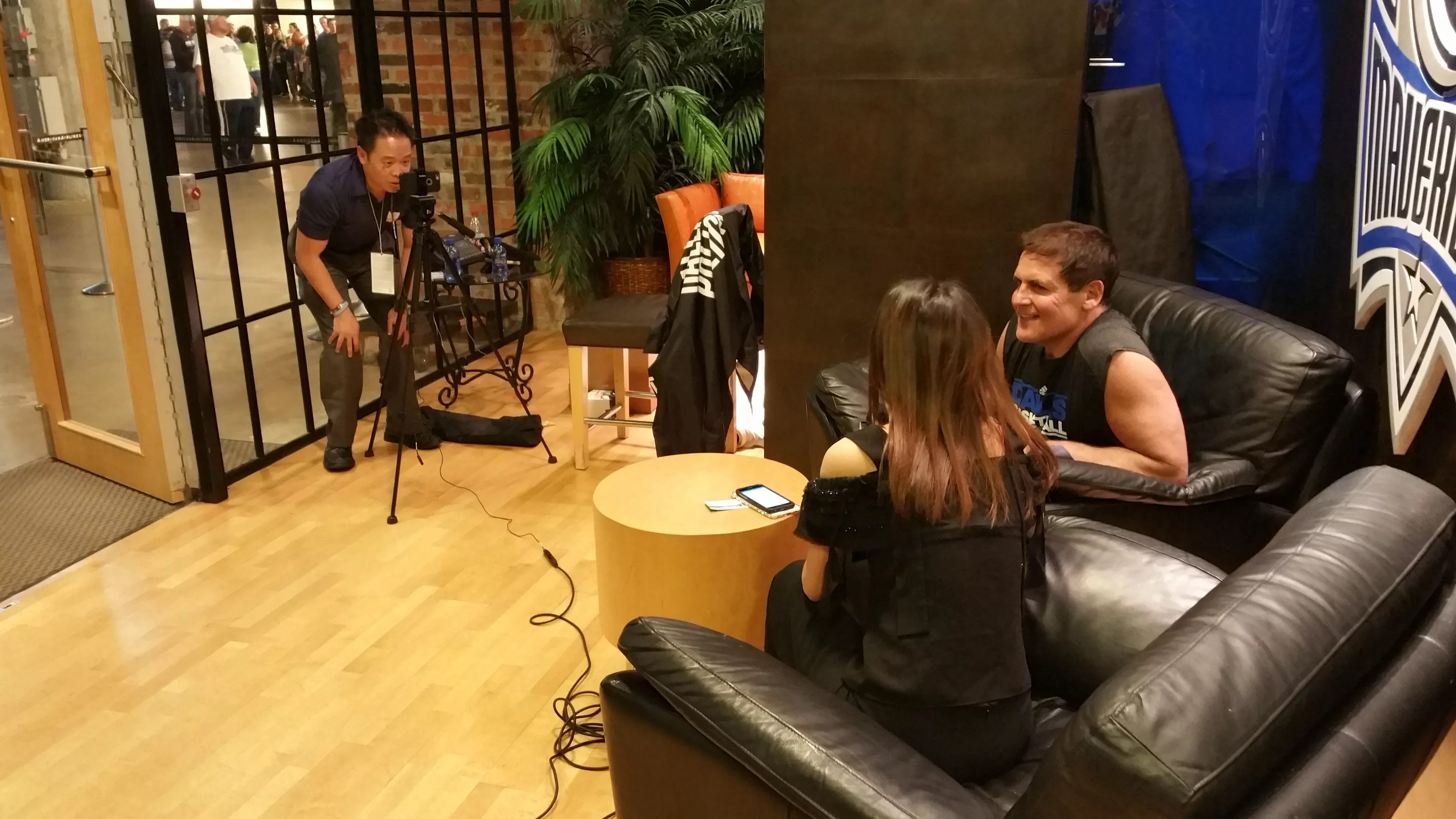 He’s wearing shorts and a sleeveless shirt, just minutes removed from the stair machine he habitually exercises on while taking pregame questions from basketball beat reporters. The two-person crew from ESPN China rates time alone with the Mavs owner. Coral Lu, international desk assignment editor, handles the interview as producer Howard Chen films.