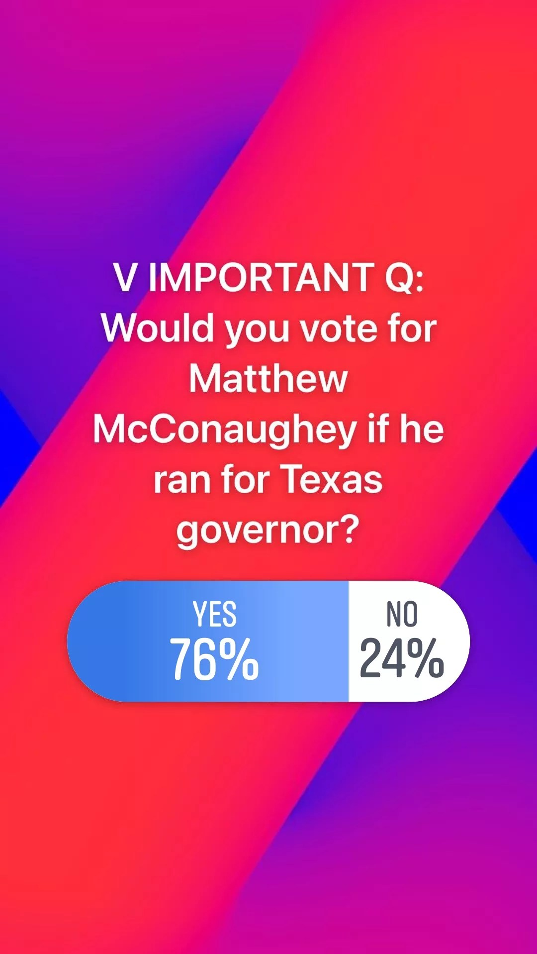 An admittedly rudimentary survey by this writer indicates McConaughey would have a solid chance – at least among Dallas-area residents. Of the 69 people who responded to the Facebook survey, 53 said they’d vote for McConaughey if he ran for Texas governor. That’s 76% in a totally unrepresentative sampling with a margin of error of lord knows.