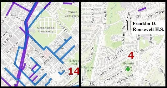 The school district report proposes three pilot areas near high schools where the district could try out its new “equity in bond planning” idea. Two are in southern Dallas – Lincoln High School & Humanities Communications (worst school name ever) a half-mile southwest of Fair Park, and Franklin D. Roosevelt High School six miles due south of downtown. The third is L.G. Pinkston High School in West Dallas, two miles west of the Margaret Hunt Hill (Calatrava) Bridge.