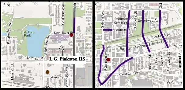 The school district report proposes three pilot areas near high schools where the district could try out its new “equity in bond planning” idea. Two are in southern Dallas – Lincoln High School & Humanities Communications (worst school name ever) a half-mile southwest of Fair Park, and Franklin D. Roosevelt High School six miles due south of downtown. The third is L.G. Pinkston High School in West Dallas, two miles west of the Margaret Hunt Hill (Calatrava) Bridge.