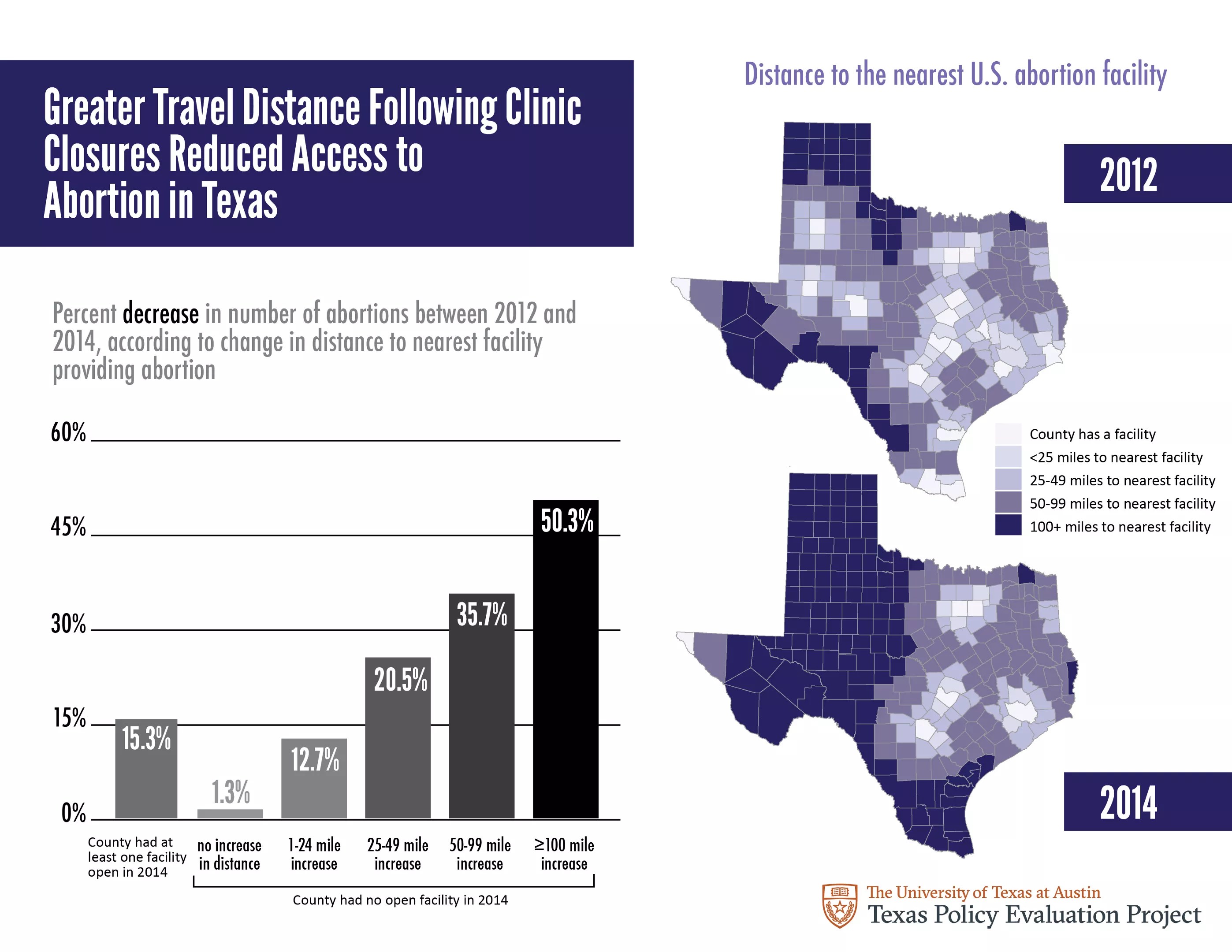 Because the law prompted closure of 24 of the states’ 41 abortion providers, many women in the state were left hundreds of miles from clinics. TxPEP’s research shows that the state’s nearly 16 percent decrease in the number of abortions performed from 2012-2014 is likely related to those increased distances.