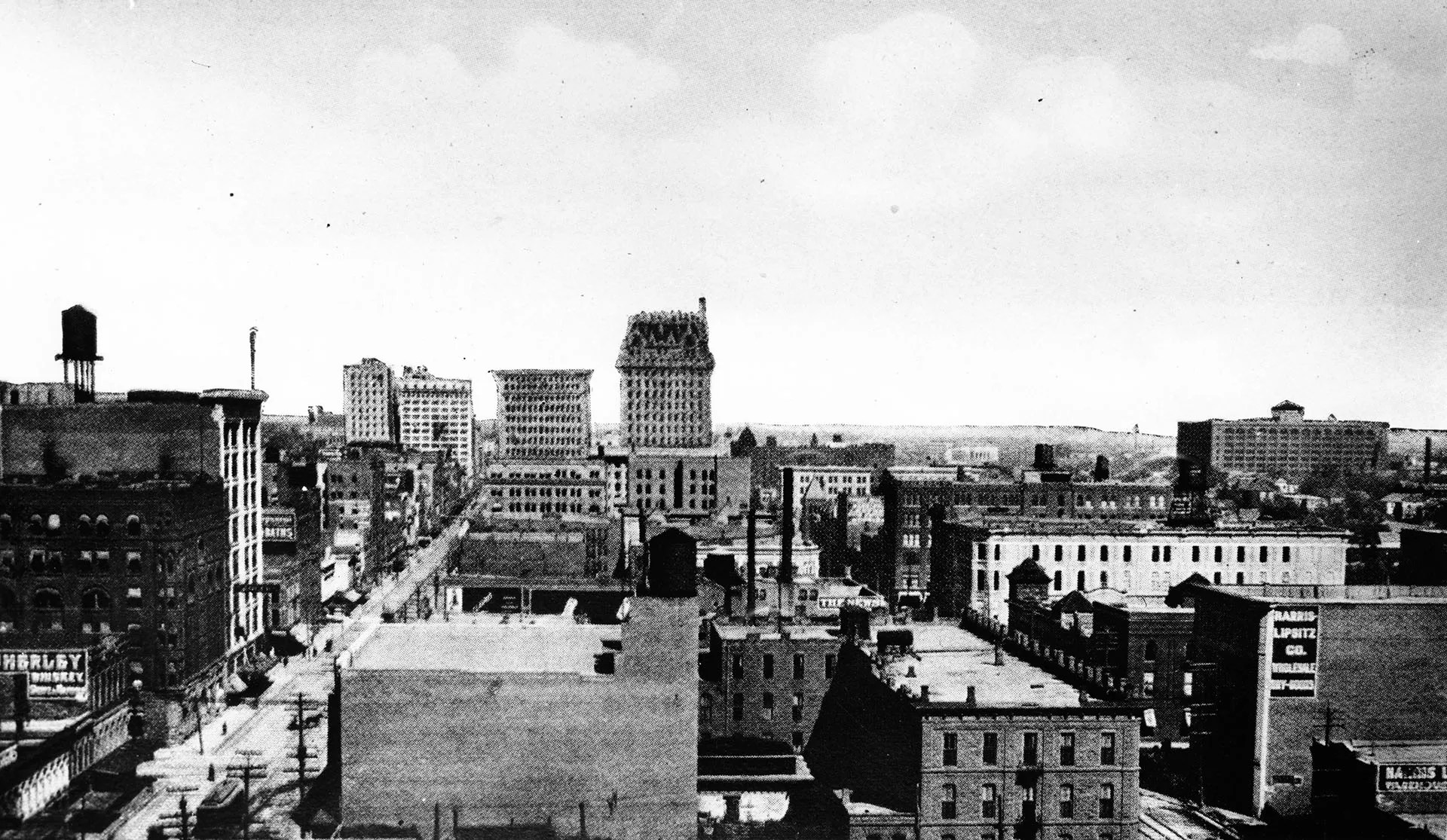 A 1968 view of downtown, prominently featuring Memorial Auditorium.