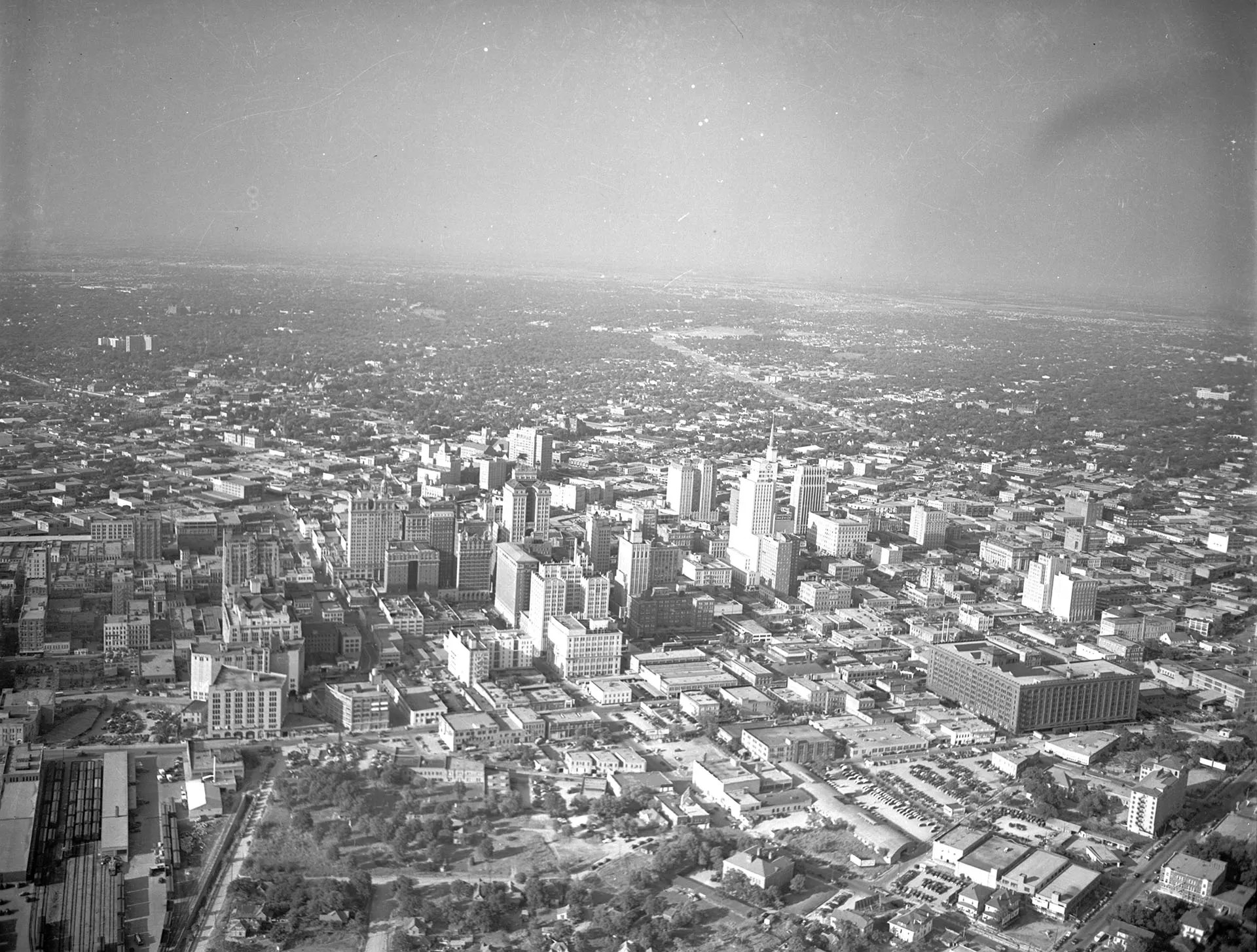 1936 skyline of Dallas, Texas, with cattle in the foreground. From the collections of the Dallas History & Archives Division, Dallas Public Library Bird’s-eye view of Dallas in 1946. From the collections of the Dallas History & Archives Division, Dallas Public Library