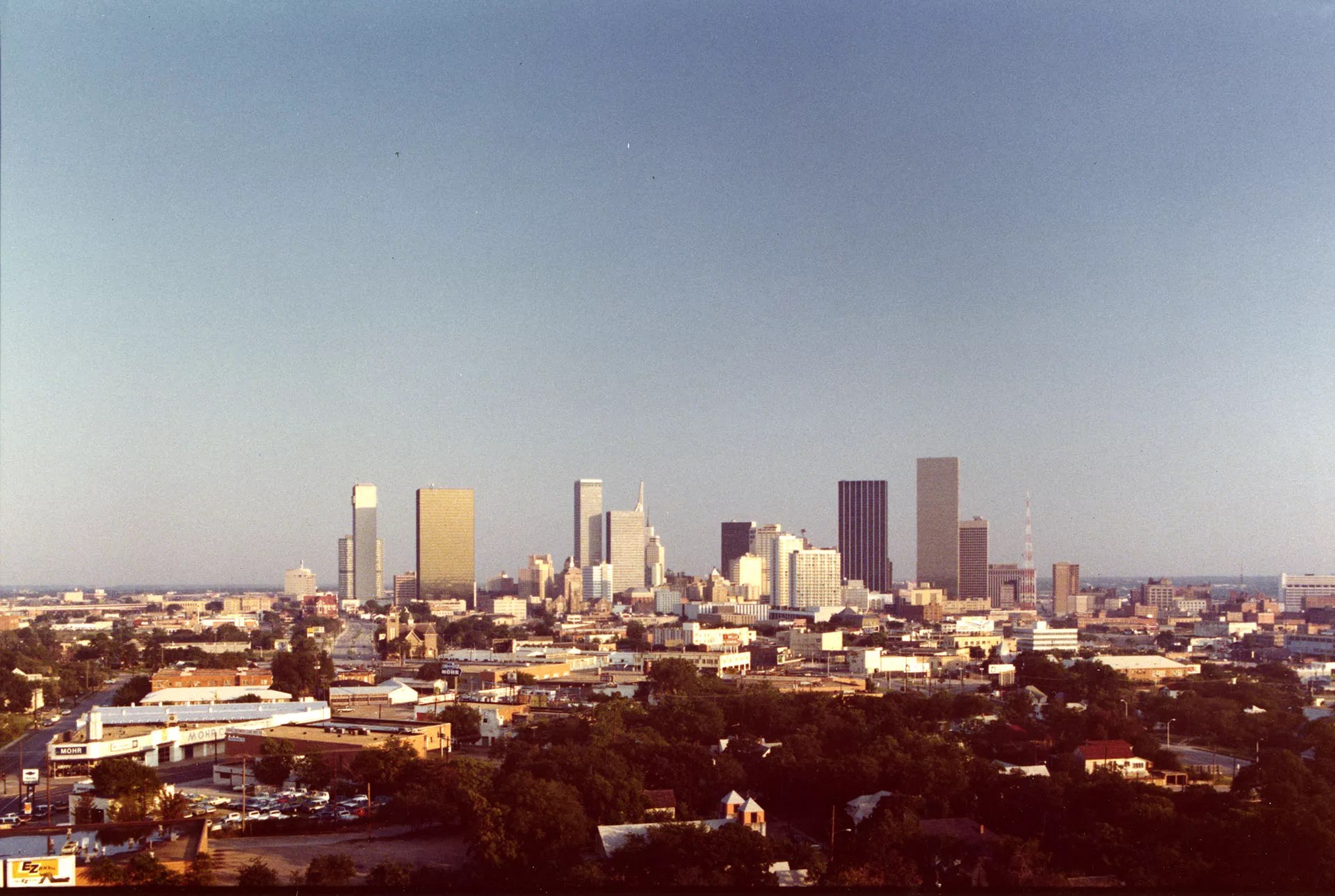 A 1990 view of downtown Dallas skyline taken from the Jefferson Avenue Viaduct From the collections of the Dallas History & Archives Division, Dallas Public Library