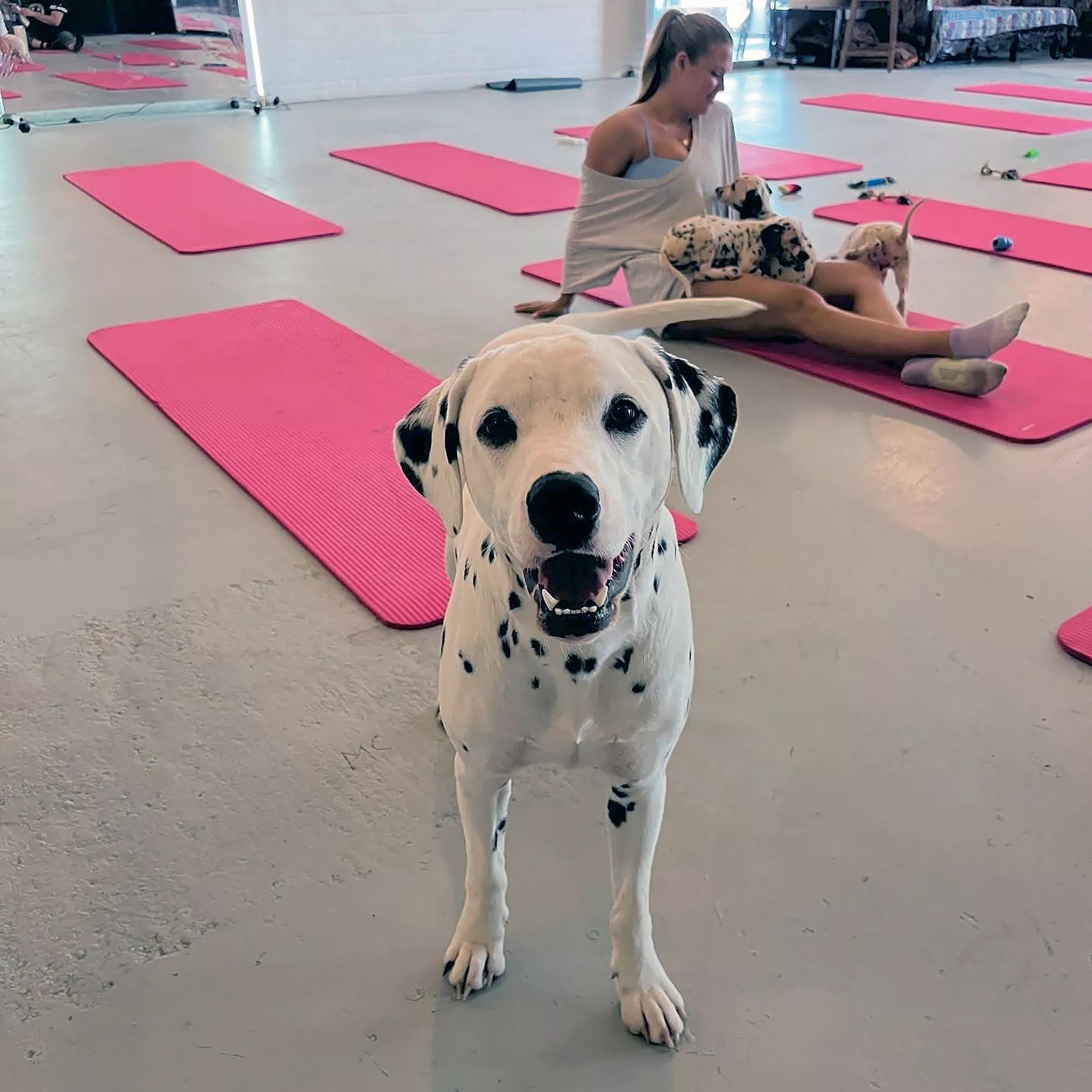 June was the second time that Lange, who has been breeding Dalmatians for three years, brought a litter of dogs to Puppies & Yoga. She first attended a class last fall and was impressed by what she saw as a transparent process and a unique opportunity for her pups, still too young to go outside and risk being exposed to viruses, to be socialized.