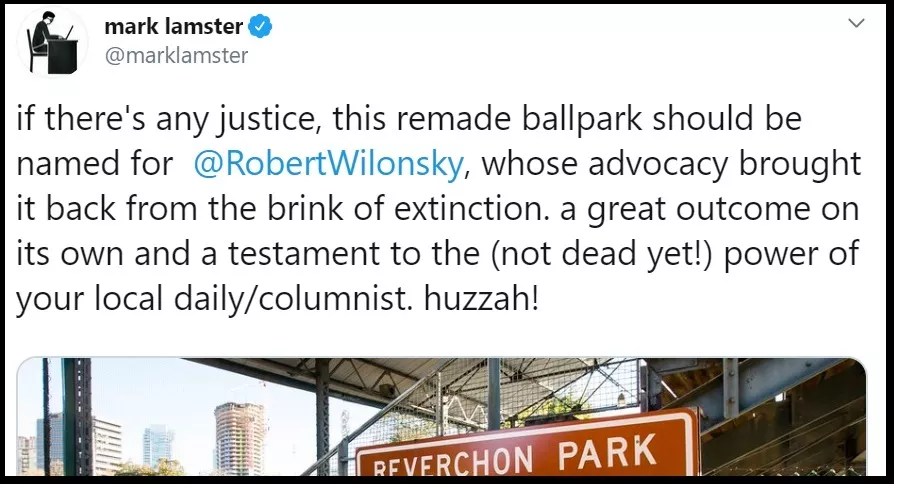 “If there’s any justice, this remade ballpark should be named for Robert Wilonsky.” — Mark Lamster