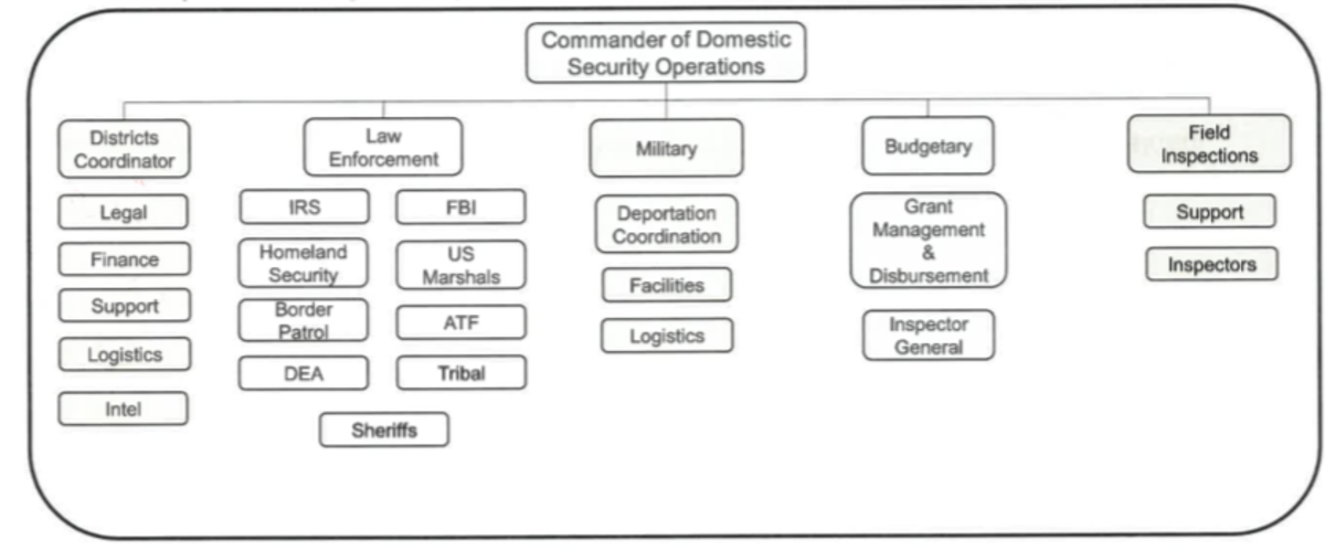 Per the internal Project 2025 documents, Headquarters Command is to be directed by a Commander of Domestic Security Operations, who will be “appointed by the President of the United States and take direction on how to conduct operations in a manner decided by the President.”