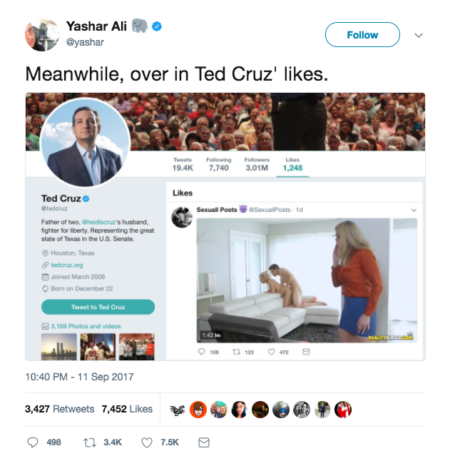@SexuallPosts published the tweet Monday, and Cruz’s social media account liked the tweet for about an hour before unliking it. The porn aggregation account then retweeted another account, using the woman in the pornographic tweet as a meme calling out the pious Cruz for liking it.