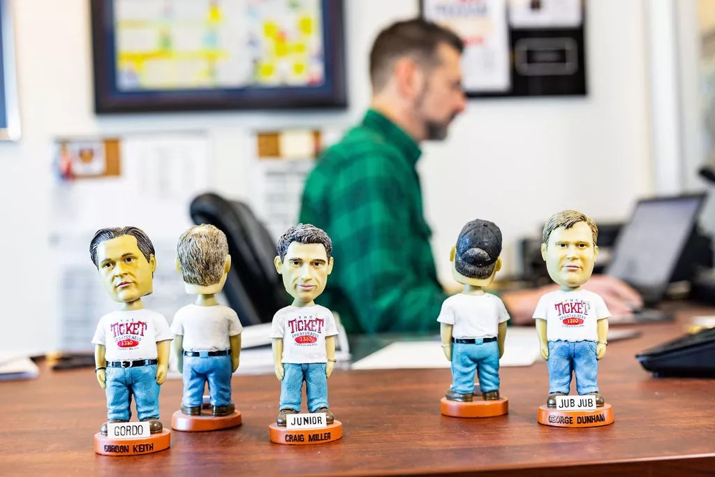 Station Program Director Jeff Catlin with bobblehead Ticket radio personalities.