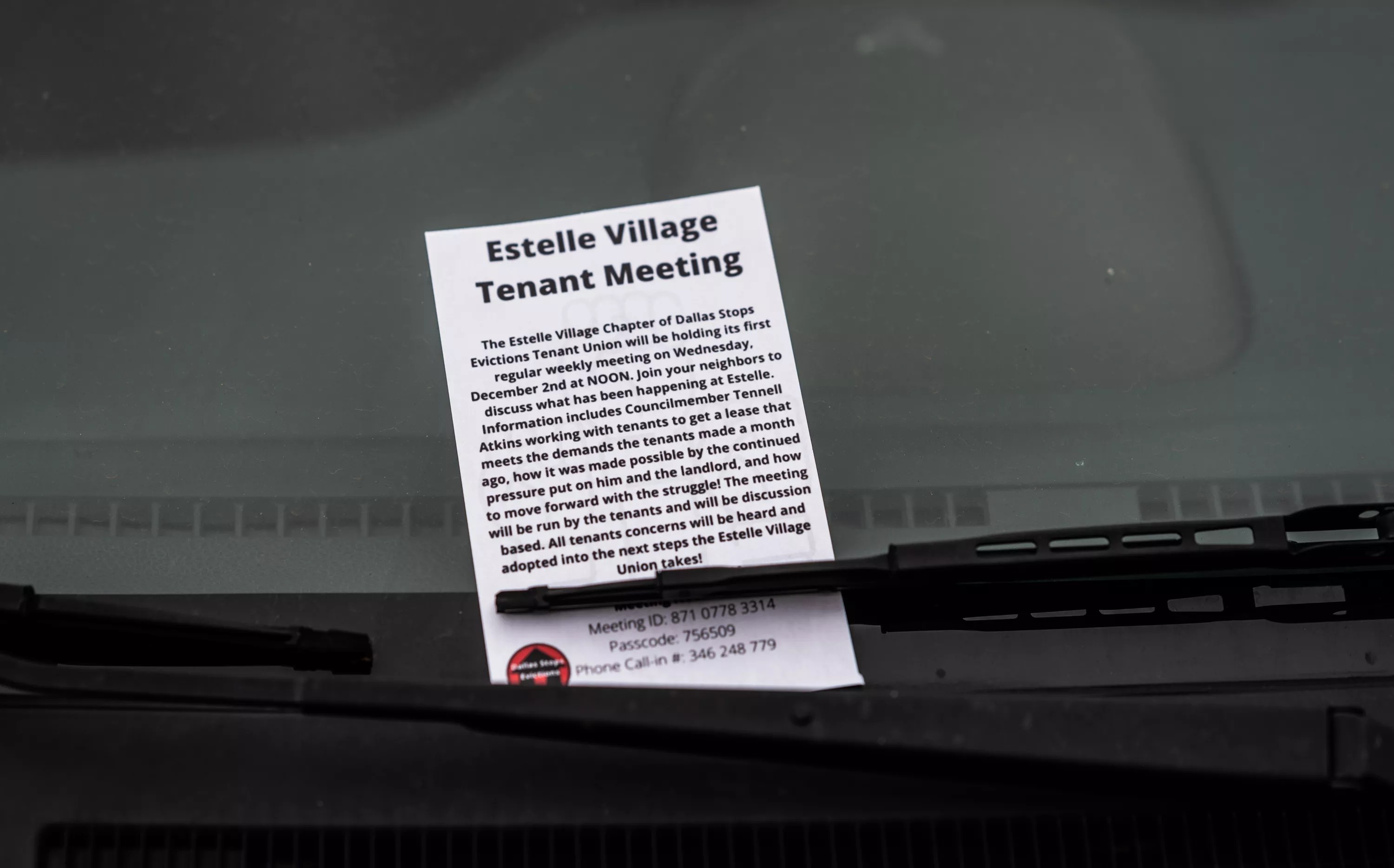 Frustrated with a lack of response, Vandergriff reached out to Dallas Stops Evictions, a coalition of activist groups formed in August just before the end of the COVID-19 eviction moratorium, after reading about their efforts to organize residents against evictions at another apartment complex. With the help of Dallas Stops Evictions activists, Vandergriff began organizing other Estelle Village residents into an informal tenants association. Their work canvassing, documenting conditions and compiling lease violations culminated in a list of 24 demands.