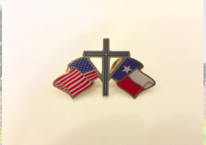 “I designed this pin to reflect my faith, and love for the state and my country,” he says. The size of the icons on the pin and the order of that sentence pretty much indicate his order of importance.