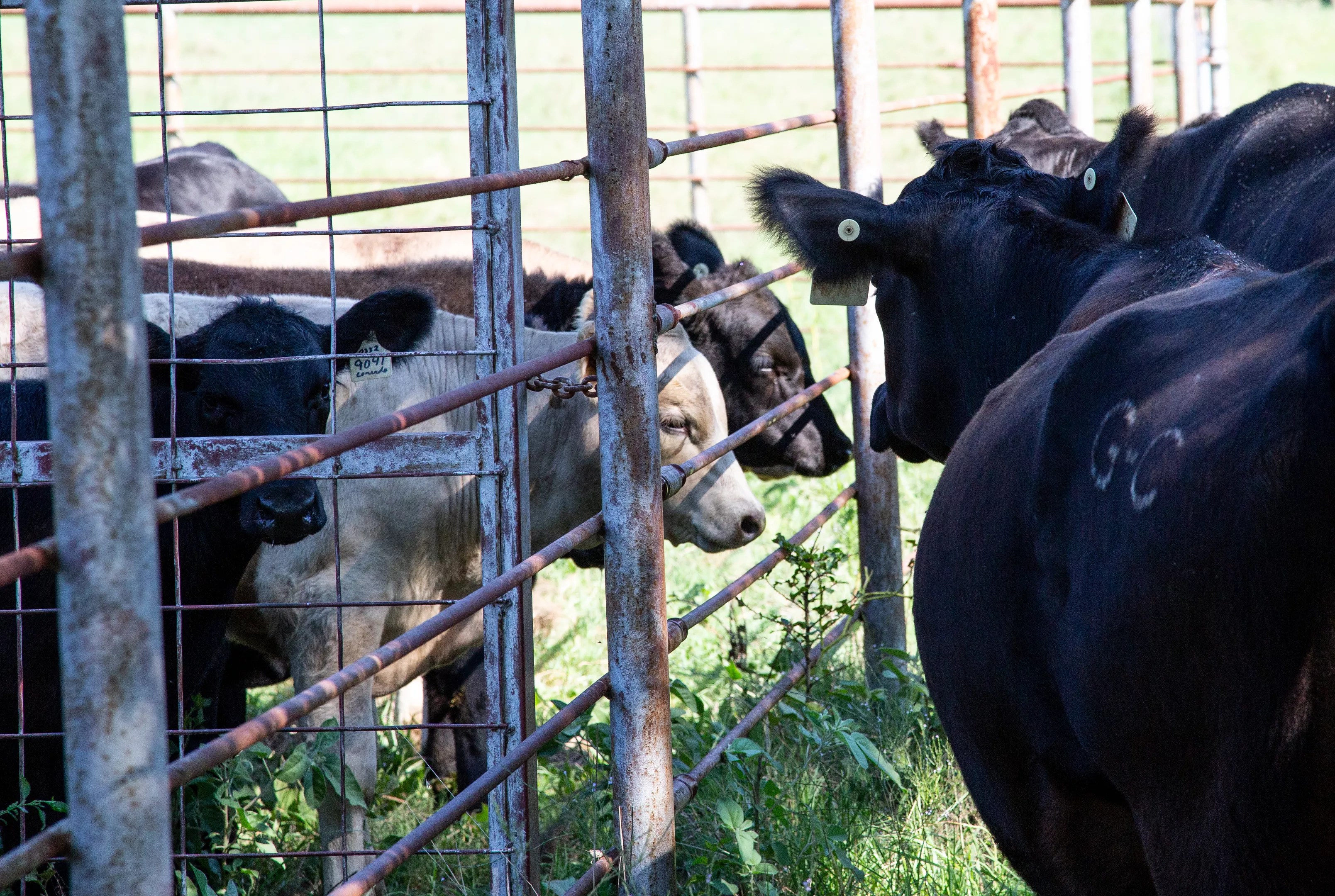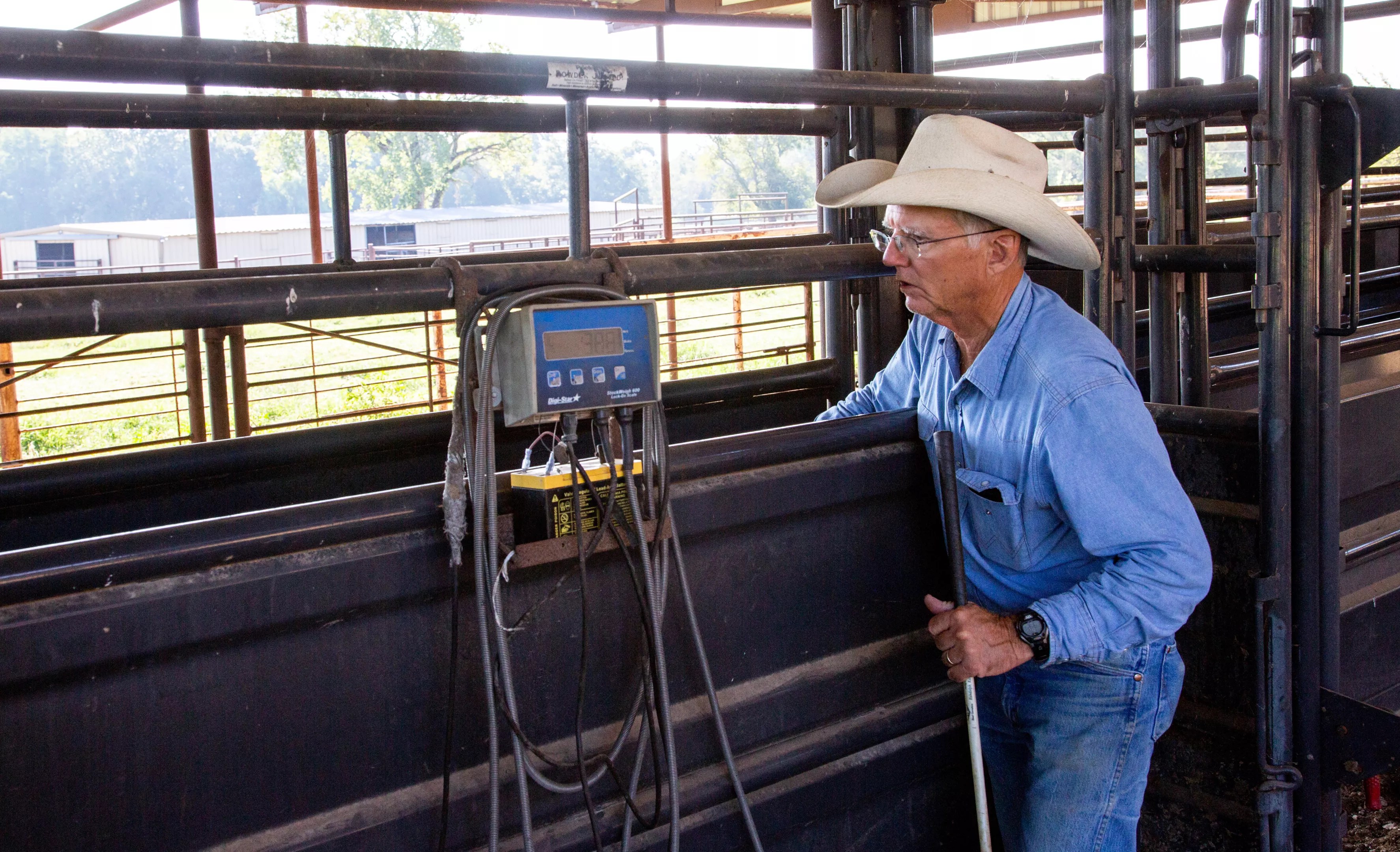 One warm, early-September morning he, Ellis, their ranch manager and a neighbor are immunizing newly weaned calves in the ranch’s working pens. Lowing and bawling occasionally, a couple of dozen Black Angus calves mill about in the enclosure. One by one, G.C. Ellis nudges them through a gate and onto the scale, enclosed by peeling painted metal bars. Ellis records the weight and tag number. Between 6 and 9 months old, they weigh in at 380 to 650 pounds.