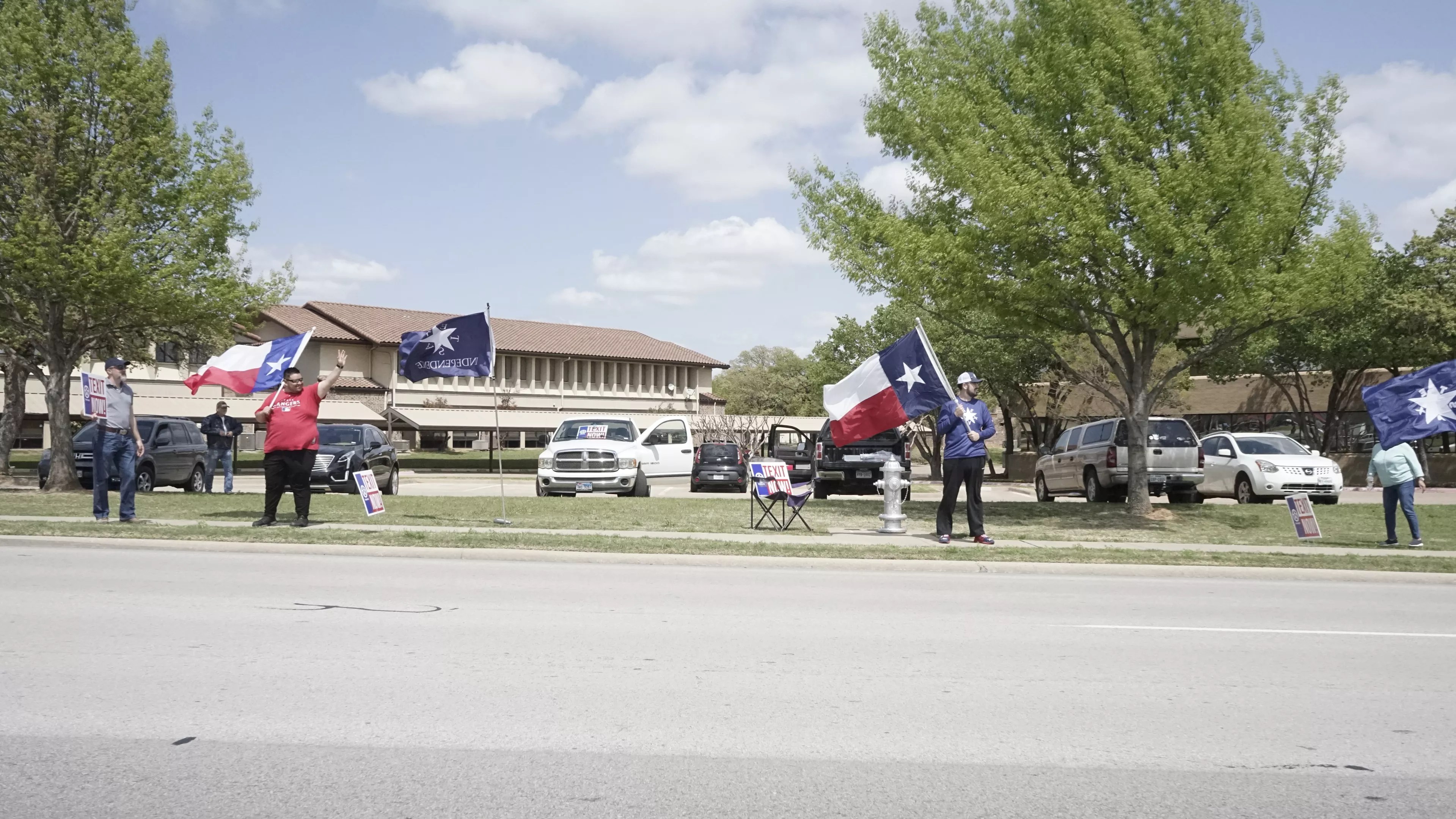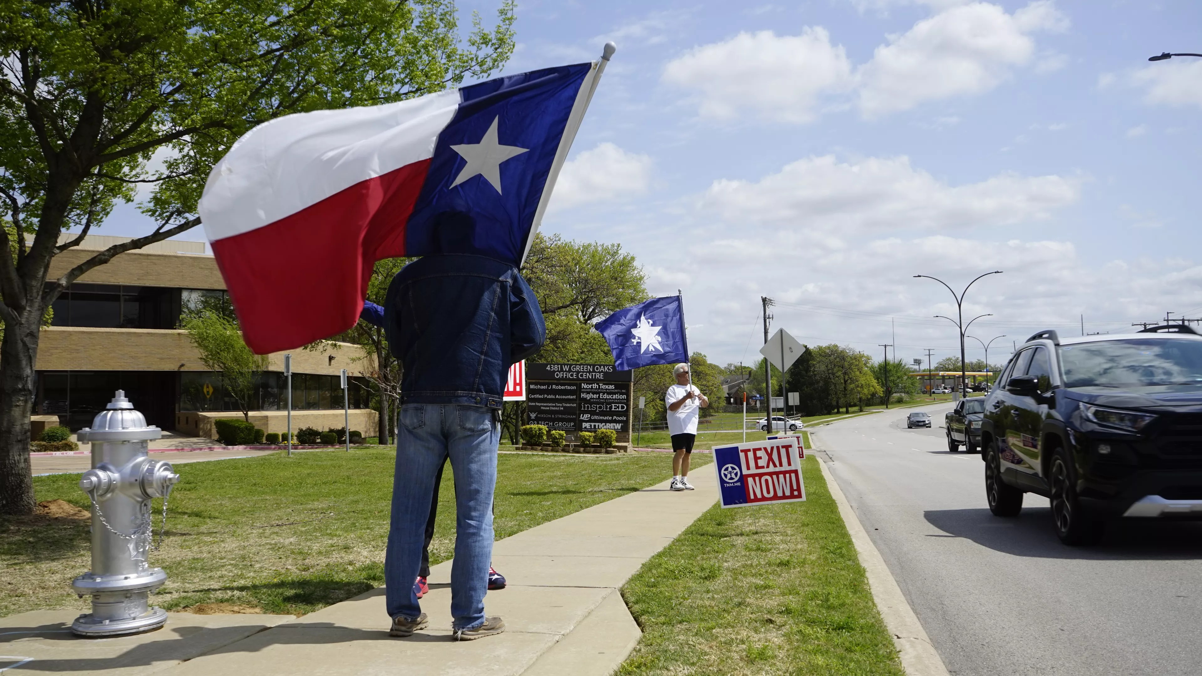 Standing outside Rep. Tony Tinderholt’s office, Shehan held a placard that read “TEXIT NOW,” his pickup parked in the lot behind him, the speakers blasting country music. Their flags beating in the breeze in the bright afternoon, his fellow nationalists waved at cars blasting past. Drivers flip them off sometimes, they said, but today it was all encouraging honks.
