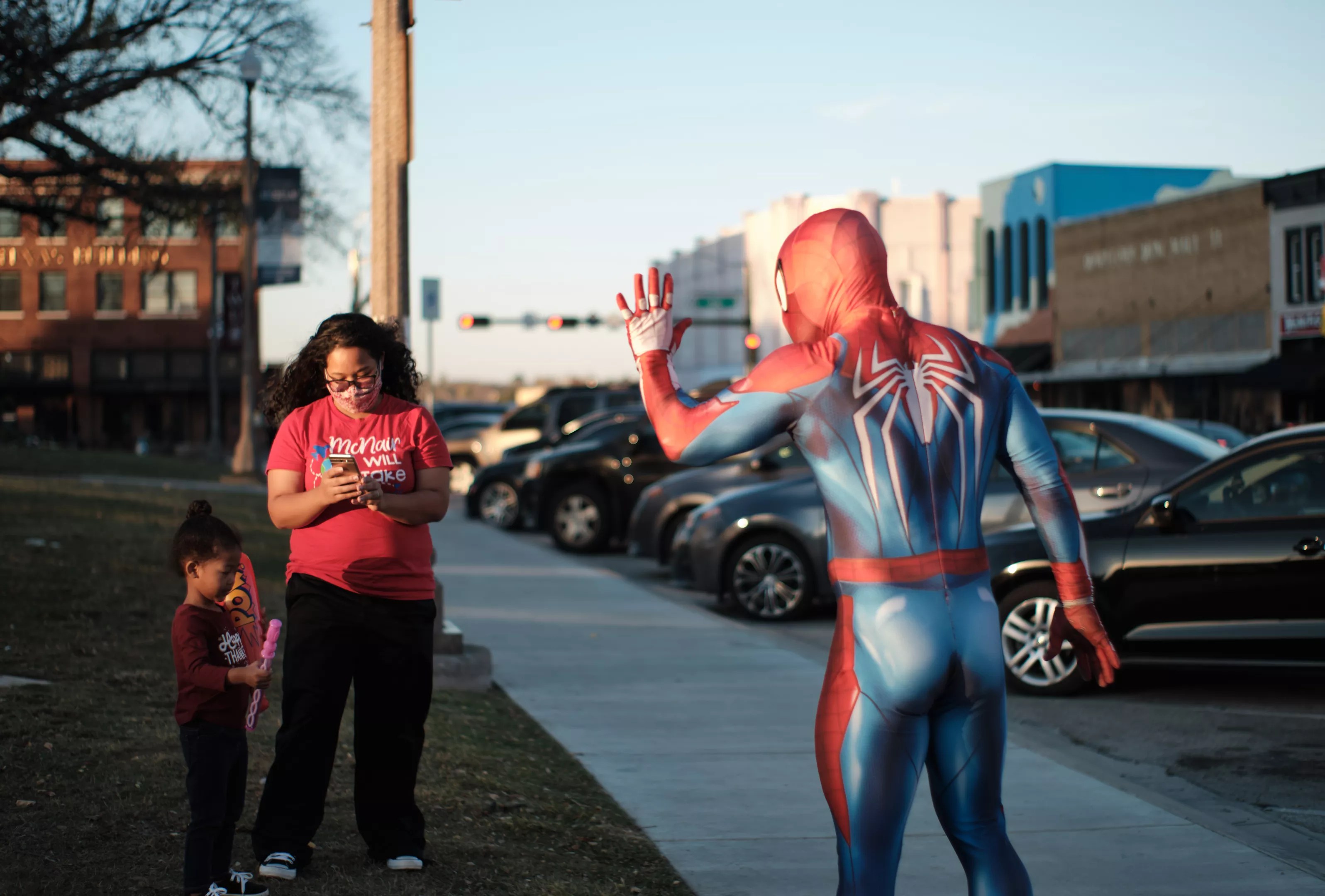 Sons says he felt compelled to don the Spidey-suit after COVID-19 hit North Texas in March.