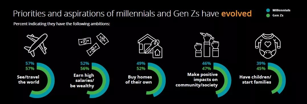 Many of the measurements in the study have less to do with mood than what young people want to do with their lives. Hint: not have kids. Not buy houses. Not buy stuff. Is that a reflection of less income and lowered economic expectations? Sorta maybe, sorta not. They want to spend money, just on other things: “Millennials value experiences,” the study says. “They aspire to travel and help their communities more than starting families or their own businesses.”
