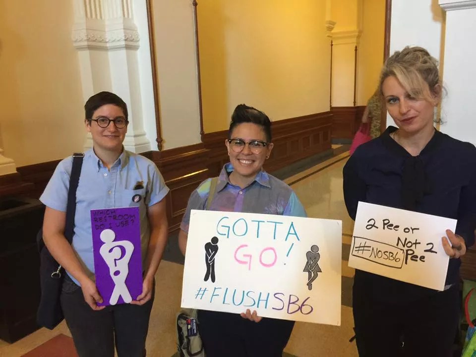 New Hope Mayor Jess Herbst and 50 other protesters planned to stand next to public bathrooms on Thursday at the state capitol holding signs to protest budget bill amendments that they claim targeted the transgender community. They had to change tactics, however, when they realized legislators have their own private bathrooms, inaccessible to the public.