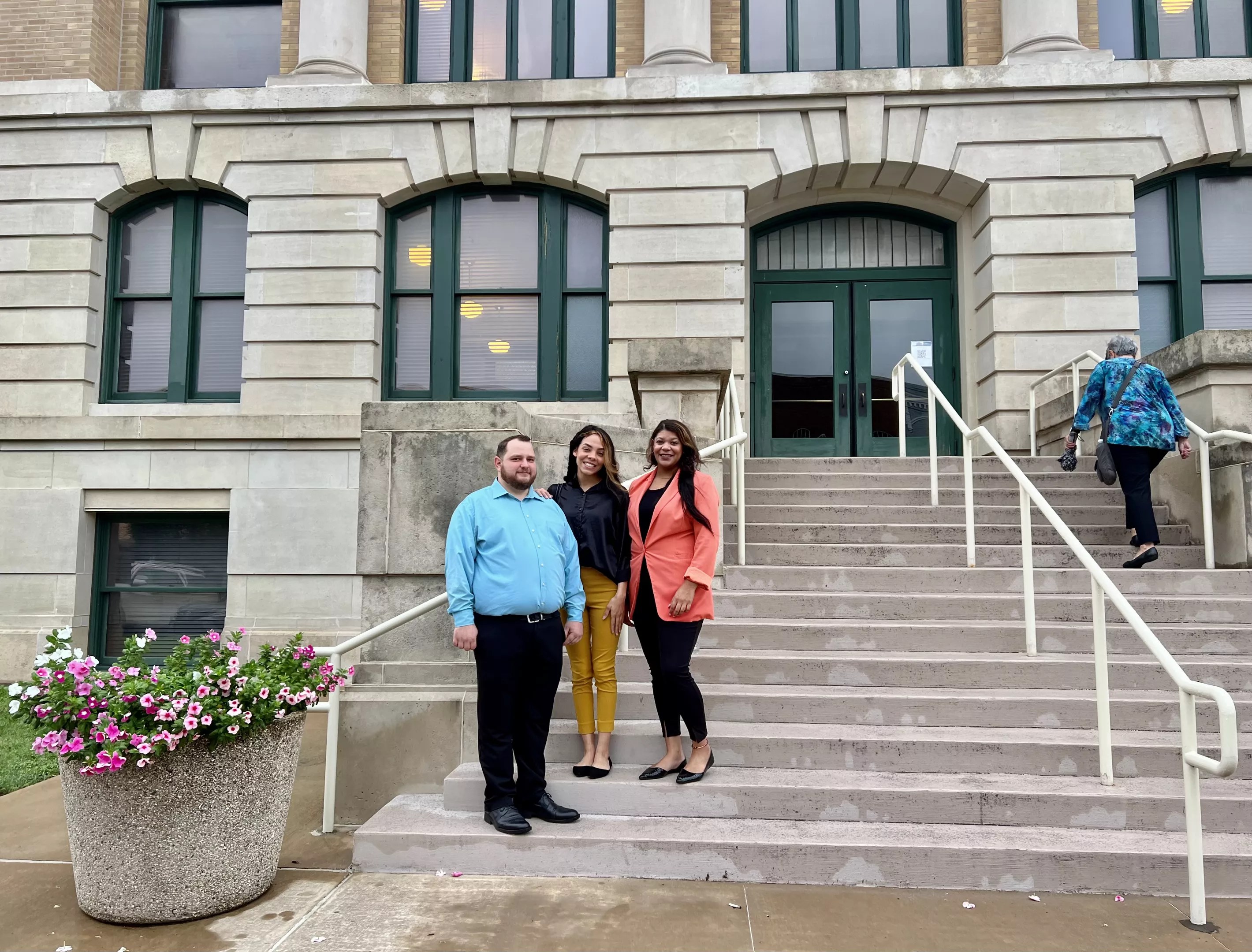 Justin Thompson, Amara Ridge and Torrey Henderson stand outside the Cooke County Courthouse on Tuesday morning.