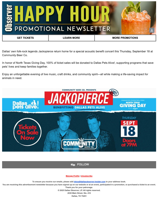 Stay informed about our Best of Dallas® winners with promotional offers and announcements from past and present title-holders. Delivered as needed Monday, Wednesday, and Friday. Once a month, we’ll also send you an editorial edition of this newsletter.