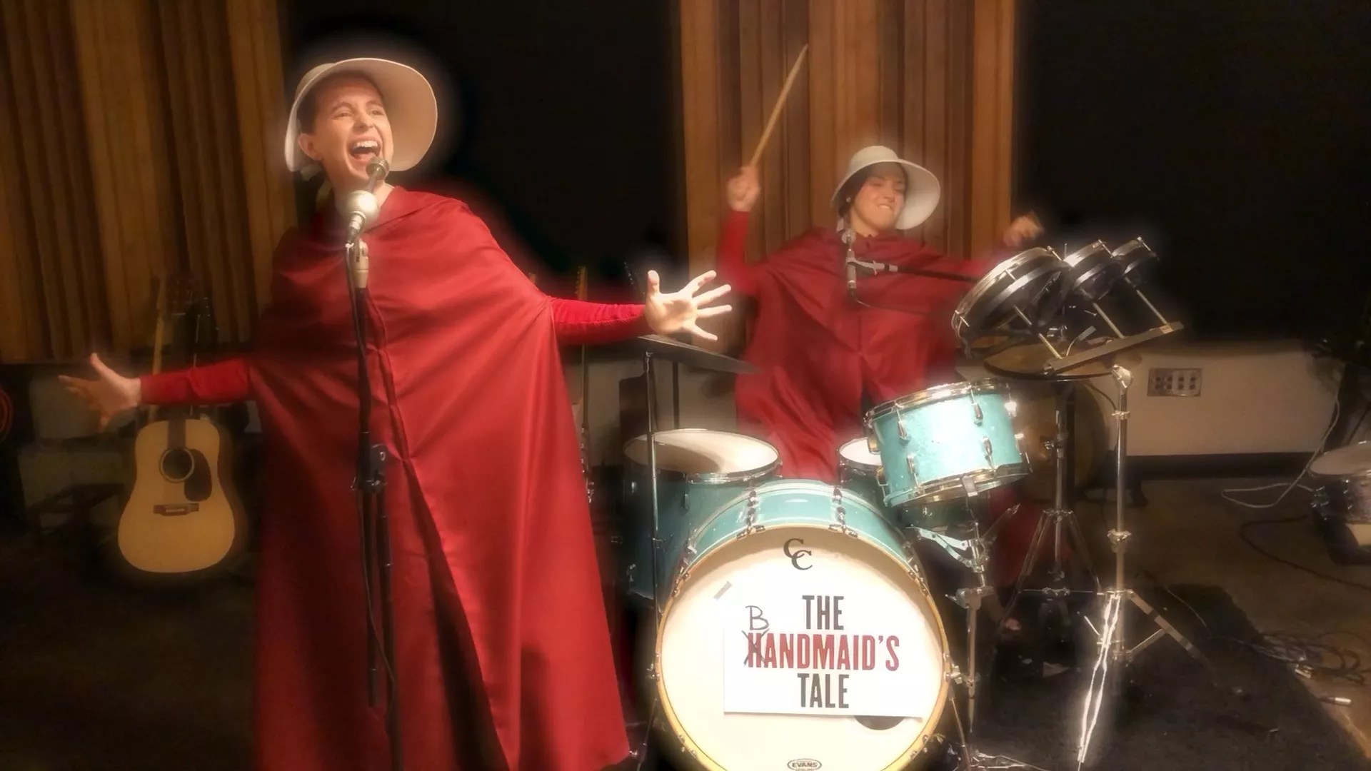There’s a dramatic introduction to Nick (played by Abernathy) and June (played by Waggy) with backlighting and overlay bubbles appearing in the corners. Handmaids (also Abernathy and Waggy) in the iconic red capes and white hoods jam out to a dramatic opening song with lyrics like “Holy guacamole, Holy praise be” and “see you in hell,” among other things. It was shot by their friend, musician Poppy Xander, their “director of iPhone photography,” at Elmwood Recording and the Texas Theatre.