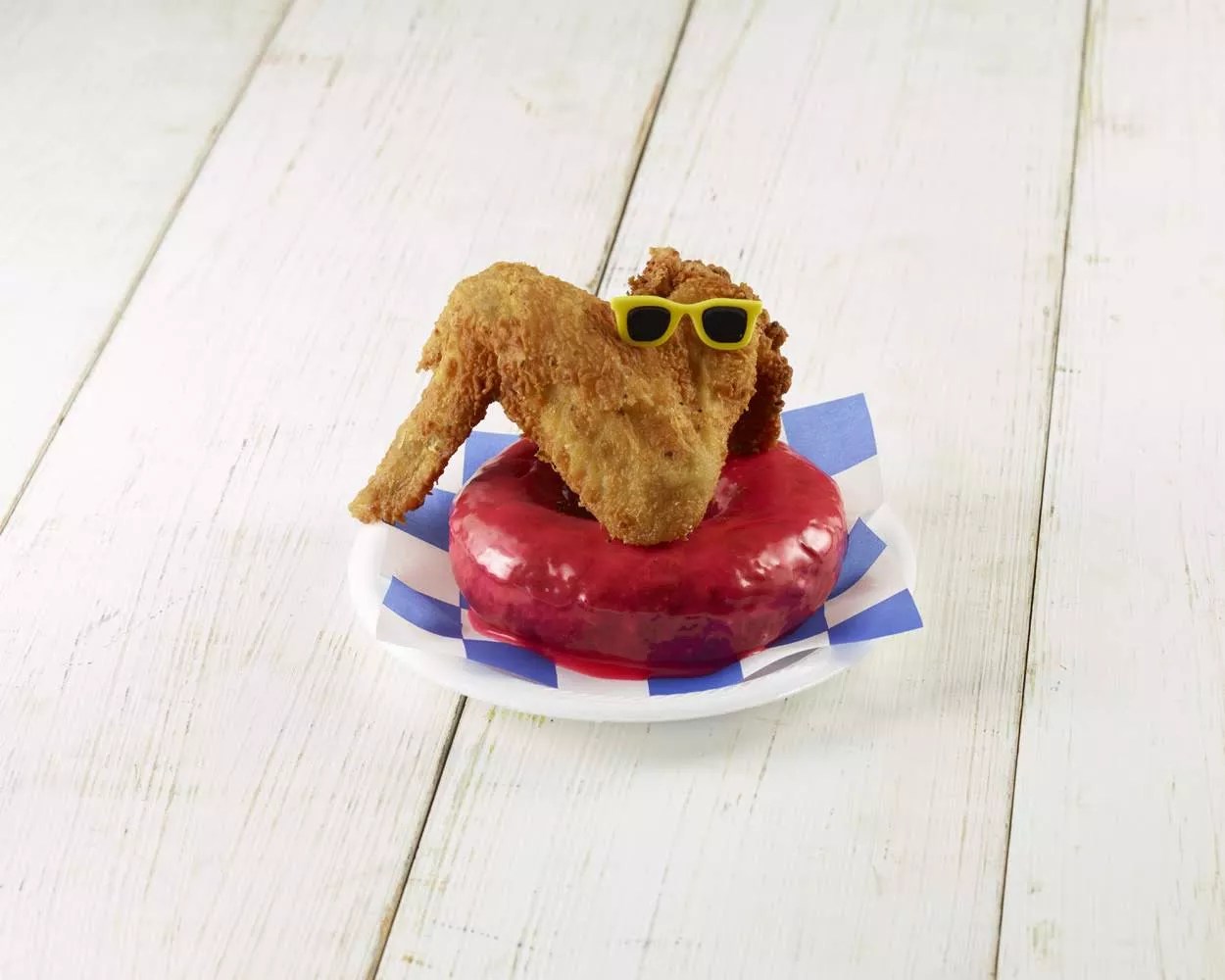 Blending the two categories of savory and sweet, this dish aims to dethrone the mighty chicken and waffles with its combination of fried and sweet. Homemade Big Red soda-flavored icing is slathered on a doughnut and topped with a deep-fried chicken wing.