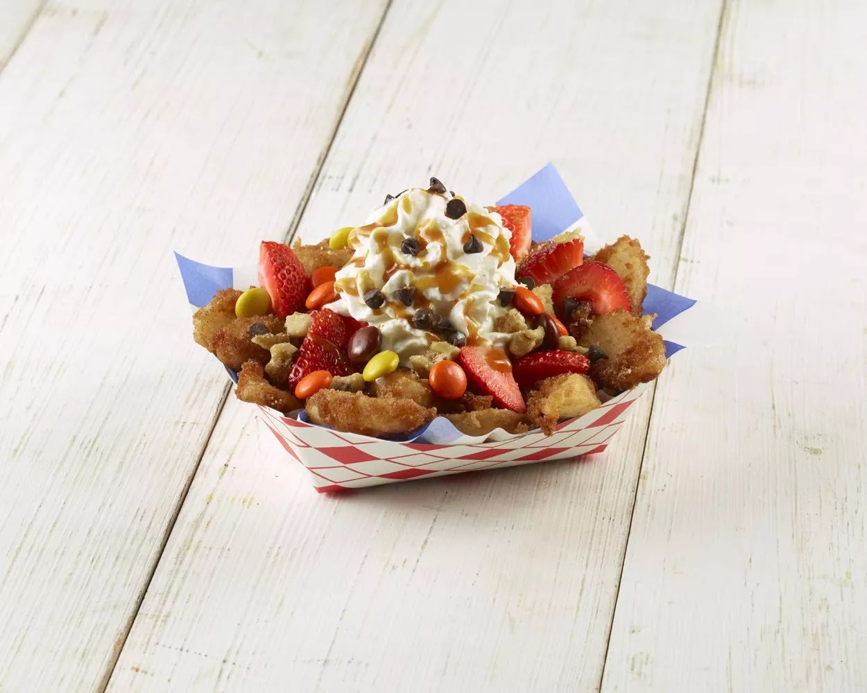 For those who want some semblance of healthy eating, this is your dish (at the fair, anyway). Juicy wedges of fresh fruit are lightly coated and fried. Upon emerging from the fryer, they are covered in a housemade, syrupy confection and garnished with fresh whipped cream, caramel and a choice of toppings, from chocolate chips to walnuts and pecans.