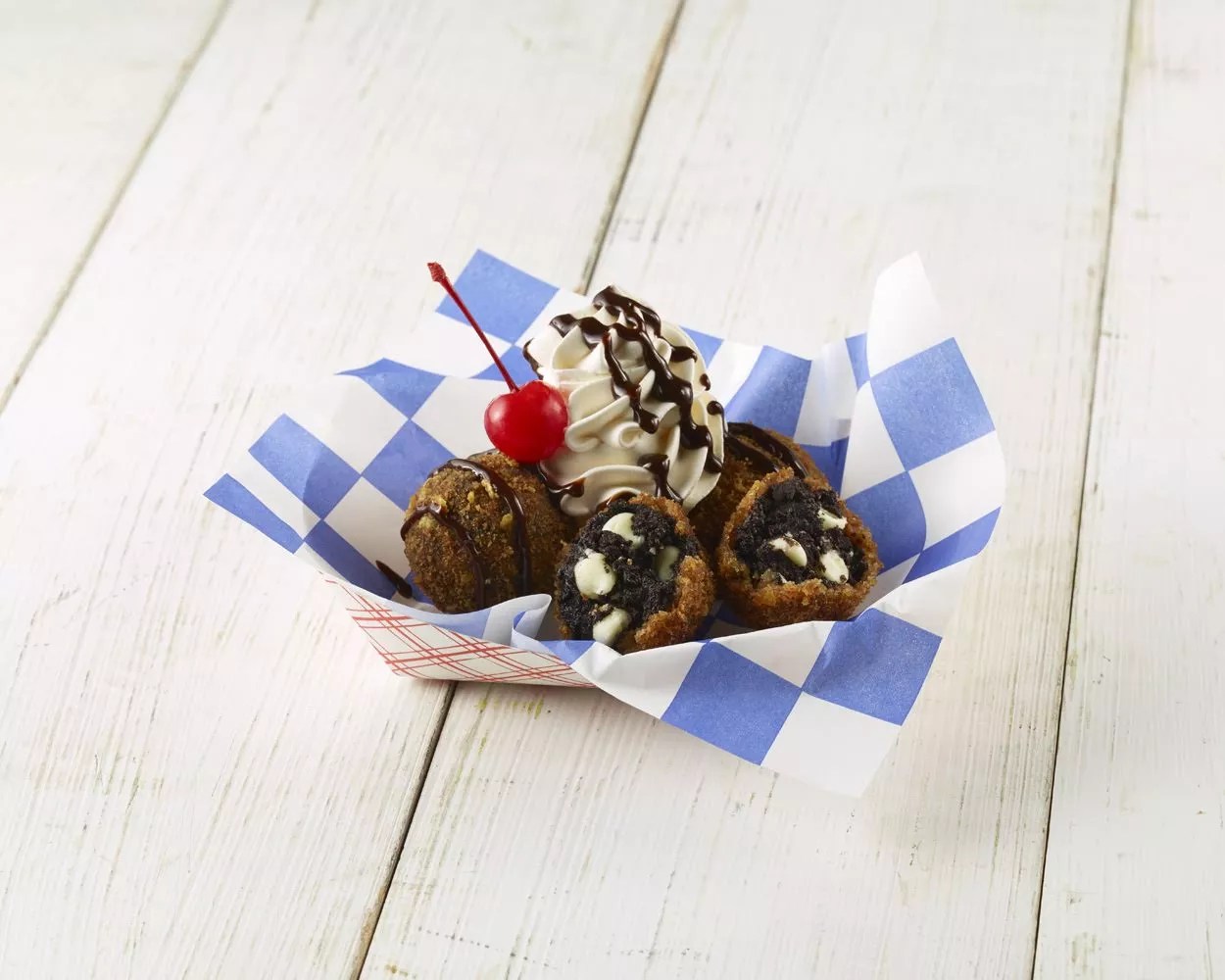 If you’ve ever made cake balls, get ready for its more mature, cooler cousin, the black gold truffles. These little balls of sweetness start with crushed chocolate cookies, cream cheese and white chocolate chips. They’re rolled into spheres, coated in a light breading of vanilla wafers, cinnamon and nutmeg, then flash-fried until crunchy on the outside and just tender on the inside. They’re then topped with whipped cream, chocolate syrup and the red cherry.