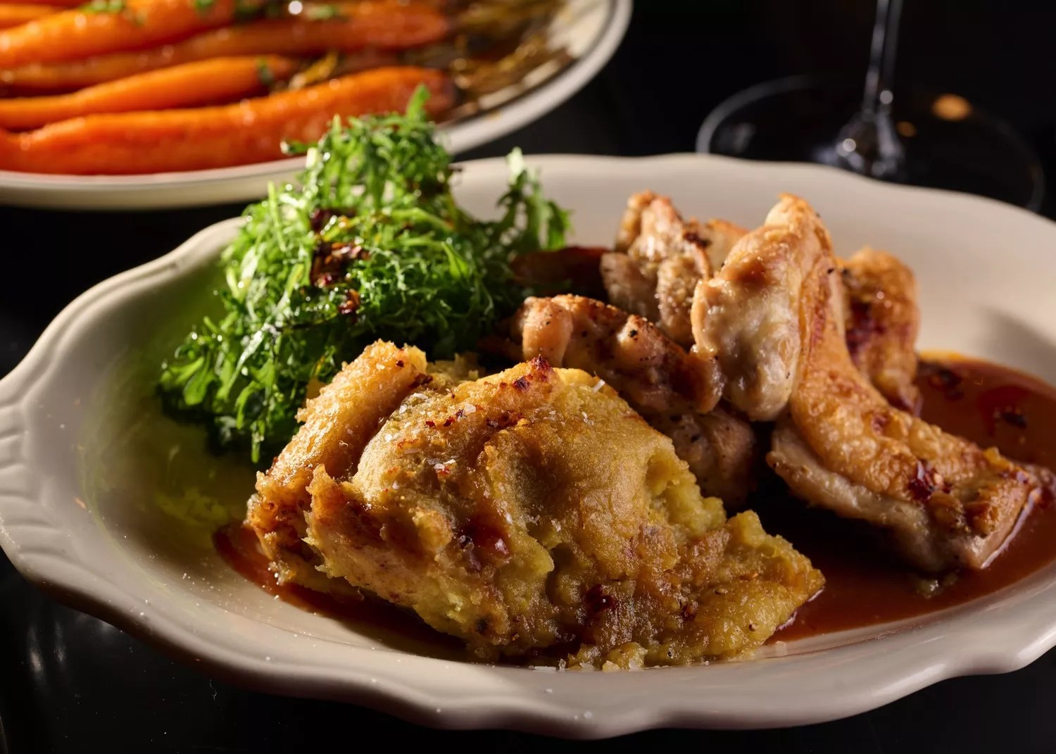 But possibly our favorite entree at Goldie’s is the “magic” chicken thighs ($28). Magic is the appropriate word, because the dish shows off some nifty sleight of hand in making different flavors pop out with each bite. There are the savory thighs themselves, pan-fried and glazed with a ginger guava sauce; meanwhile, mashed yams play harmony with mustard greens that provide a pungent and peppery counterpoint. You may never order a boring chicken breast ever again.
