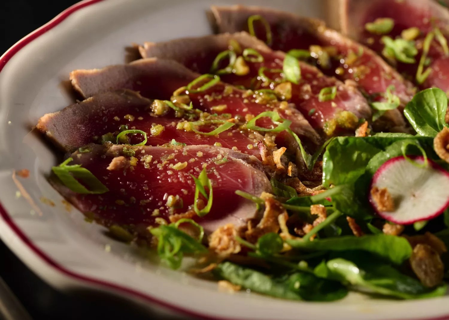 Slices of bluefin tuna dressed in ponzu sauce make up the tuna tataki appetizer.