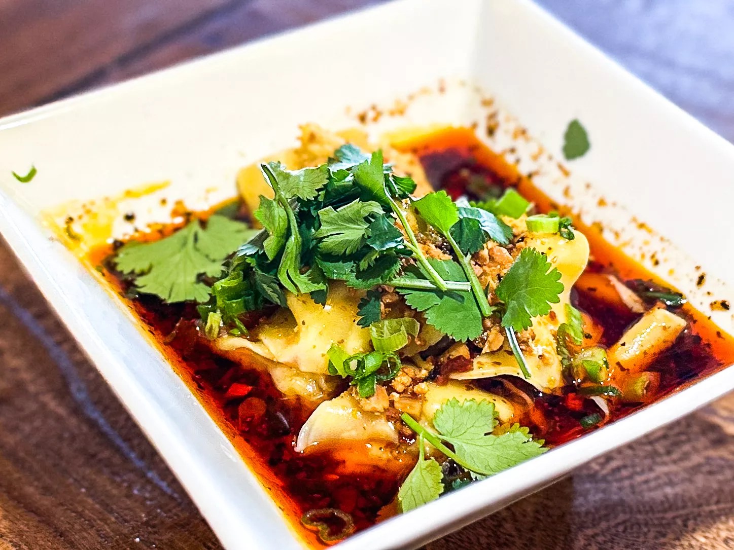 This was followed by an order of soup dumplings. The xiao long bao arrived at the table in a bamboo steamer, and the dumplings had thankfully cooled down a bit, making them much easier to eat. No fear of that first bite squirting scorching hot soup filling which, truth be told, often lessens the enjoyment of the dish a bit. Temperature-wise, then, these were great; flavor-wise, a bit middling. Spicy wonton. Hank Vaughn