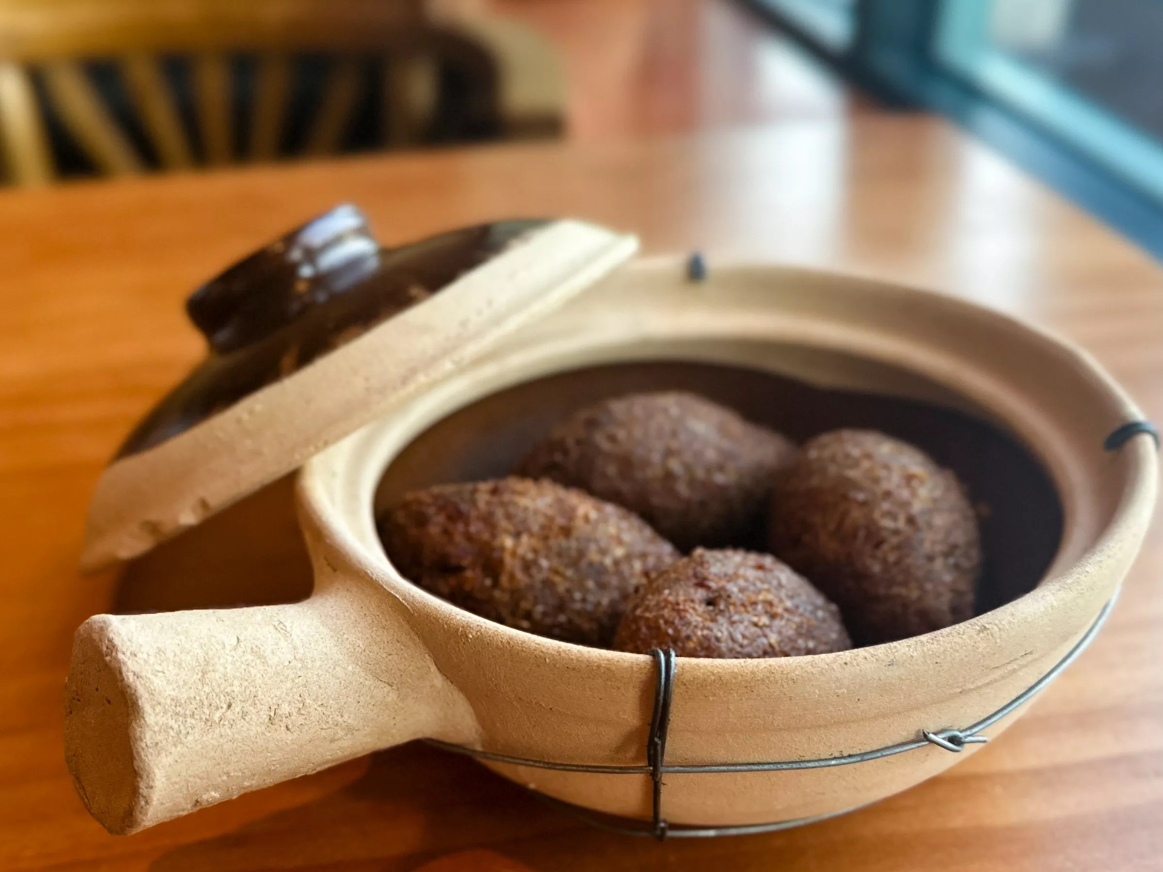 Next up was kibbeh, considered the national dish of both Lebanon and Syria. These fried balls of bulgur wheat are stuffed with beef and onion and come four to a serving. They arrived at the table attractively presented in a small earthenware pot.