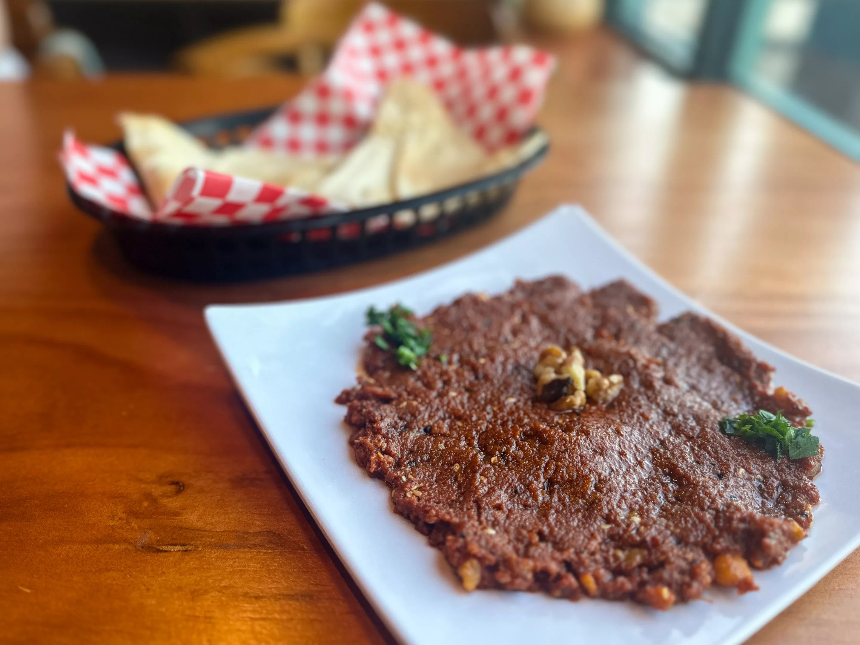 The dining space is a cozy, warmly lit space of wood and tile, decorated with numerous Mediterranean-style earthen pots, bronze trinkets and wall art. We took a table near the window during dinner and started to study the menu, which had several popular Mediterranean favorites such as falafel, shawarma and baba ghanoush, but also included options from Lebanon, Yemen and, of course, Syria. Offerings from Syria included yalinge, a vegetarian stuffed grape leaf appetizer, and sujuk, a spicy fermented sausage wrapped in pita bread with pickles. It’s playfully referred to as a Syrian hot dog and is listed under sandwiches. Muhammara: roasted red pepper and walnut dip. Hank Vaughn