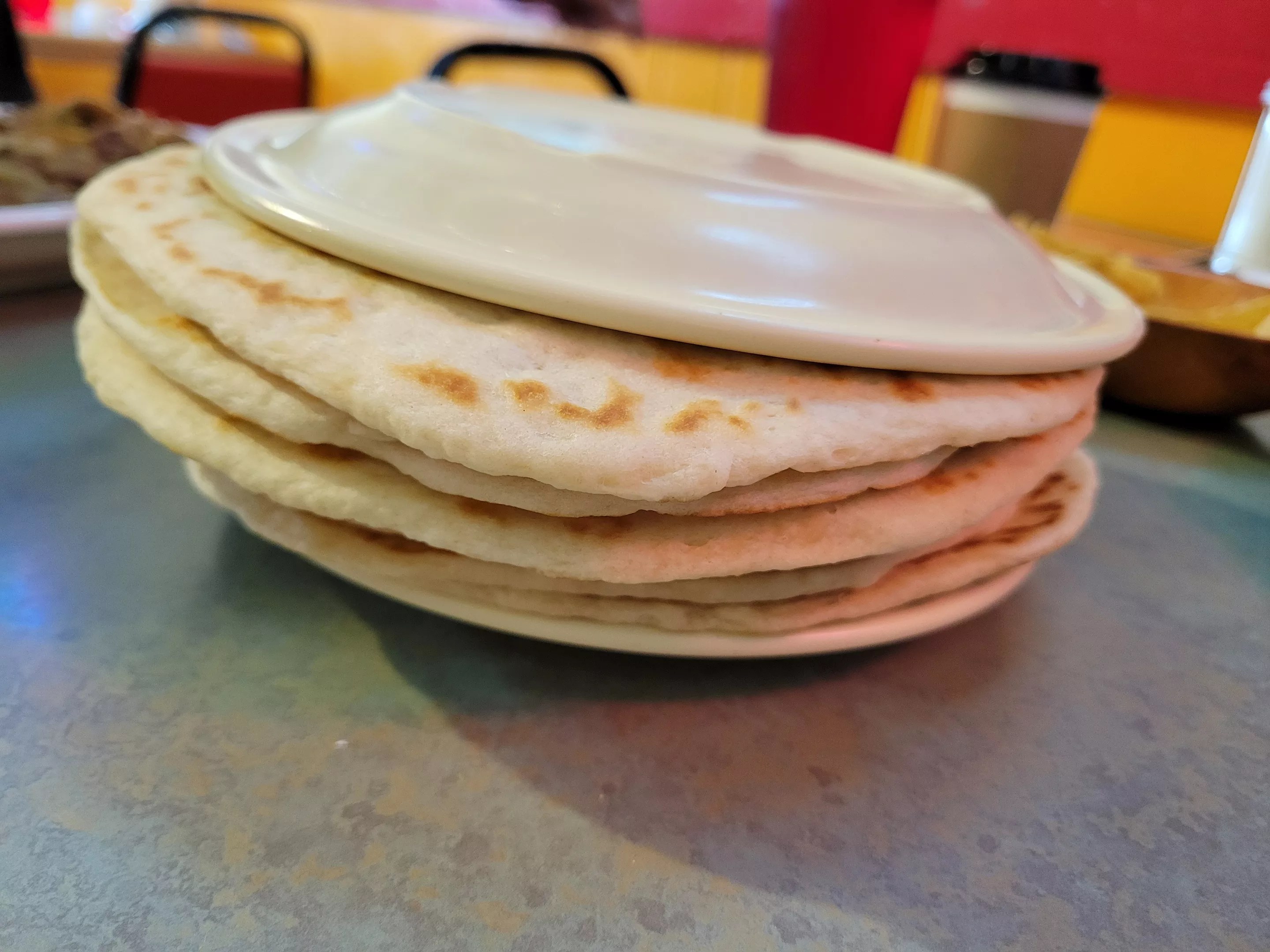 Right before the meal, and after we ate two bowls of chips and salsa, a plate of what looked like a massive stack of buttermilk pancakes was deposited on the table. These homemade tortillas are the perfect weapon to take down saucy dishes. Each plate also came with a mound of fluffy Mexican rice coupled with an oasis of creamy rich refried beans.
