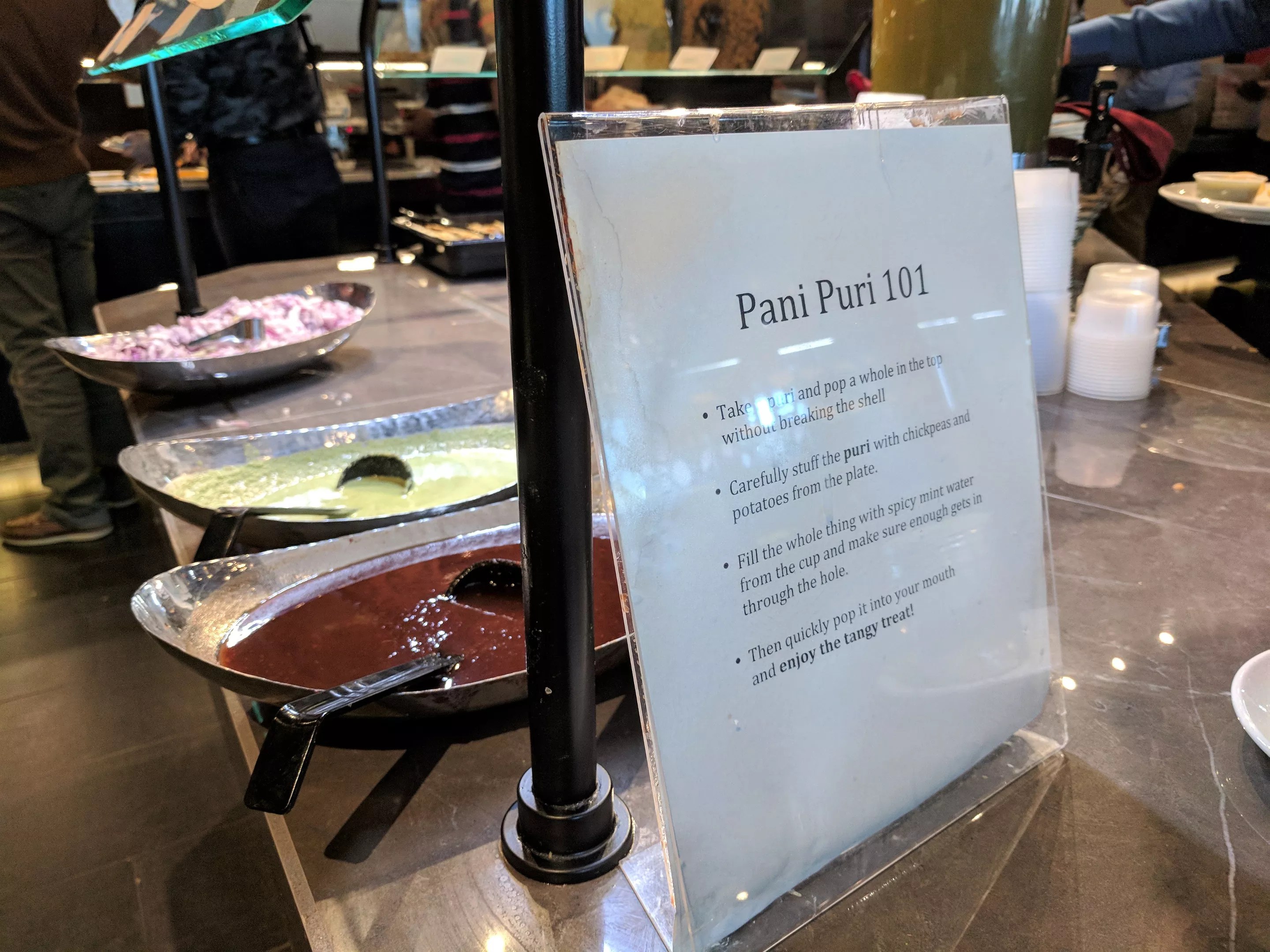 When I went back for seconds, I returned with two varieties of grilled chicken – malai and tandoori – along with a veggie samosa, onion pakoras, chicken tikka masala, a piece of naan and a bowl of dal. There was certainly still much more left to try, including a build-your-own pani puri station with a sign listing instructions for customers who haven’t tried pani puri before. But 19 different foods isn’t too bad.