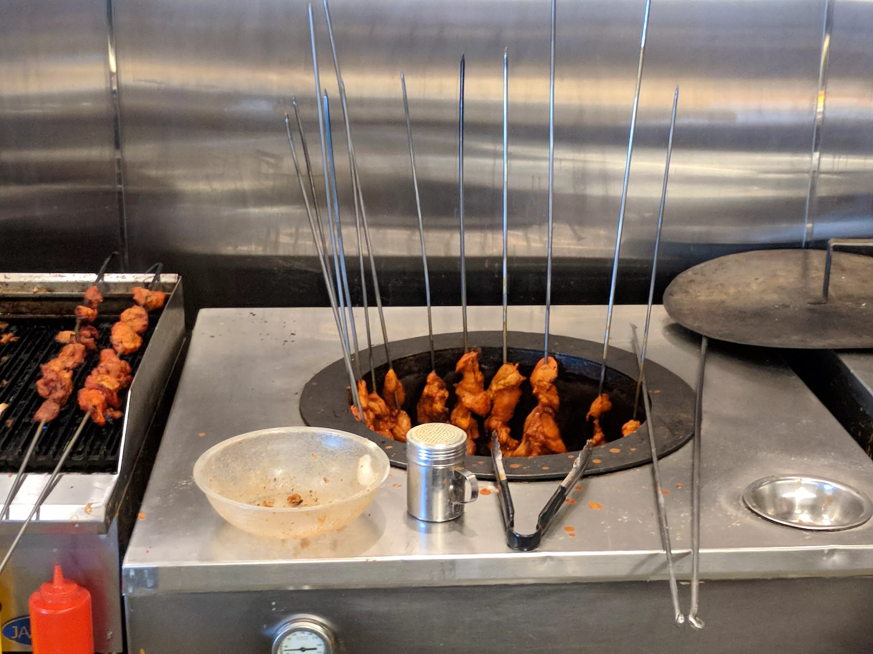 Tandoori chicken on skewers and in the oven just behind the buffet line.