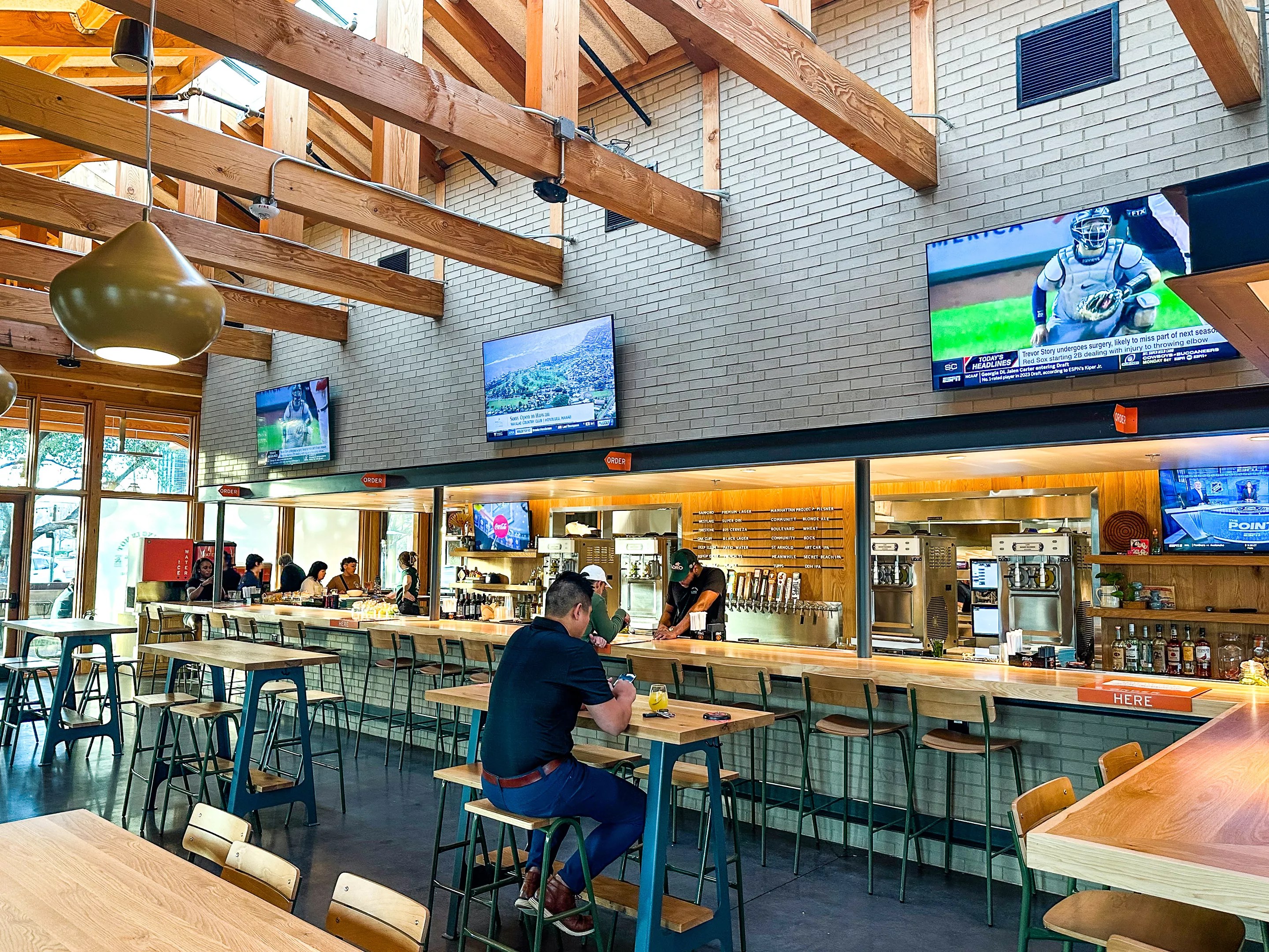 Our second round of drinks included a ginger old fashioned (fair, but a bit on the sweet side) and a few more bites: a crispy smoked chicken sandwich, a Loro cheeseburger and some brisket tostadas. Once the food was ready, we made our way outside and cozied up in a couple of comfy chairs and a porch swing to dig in.
