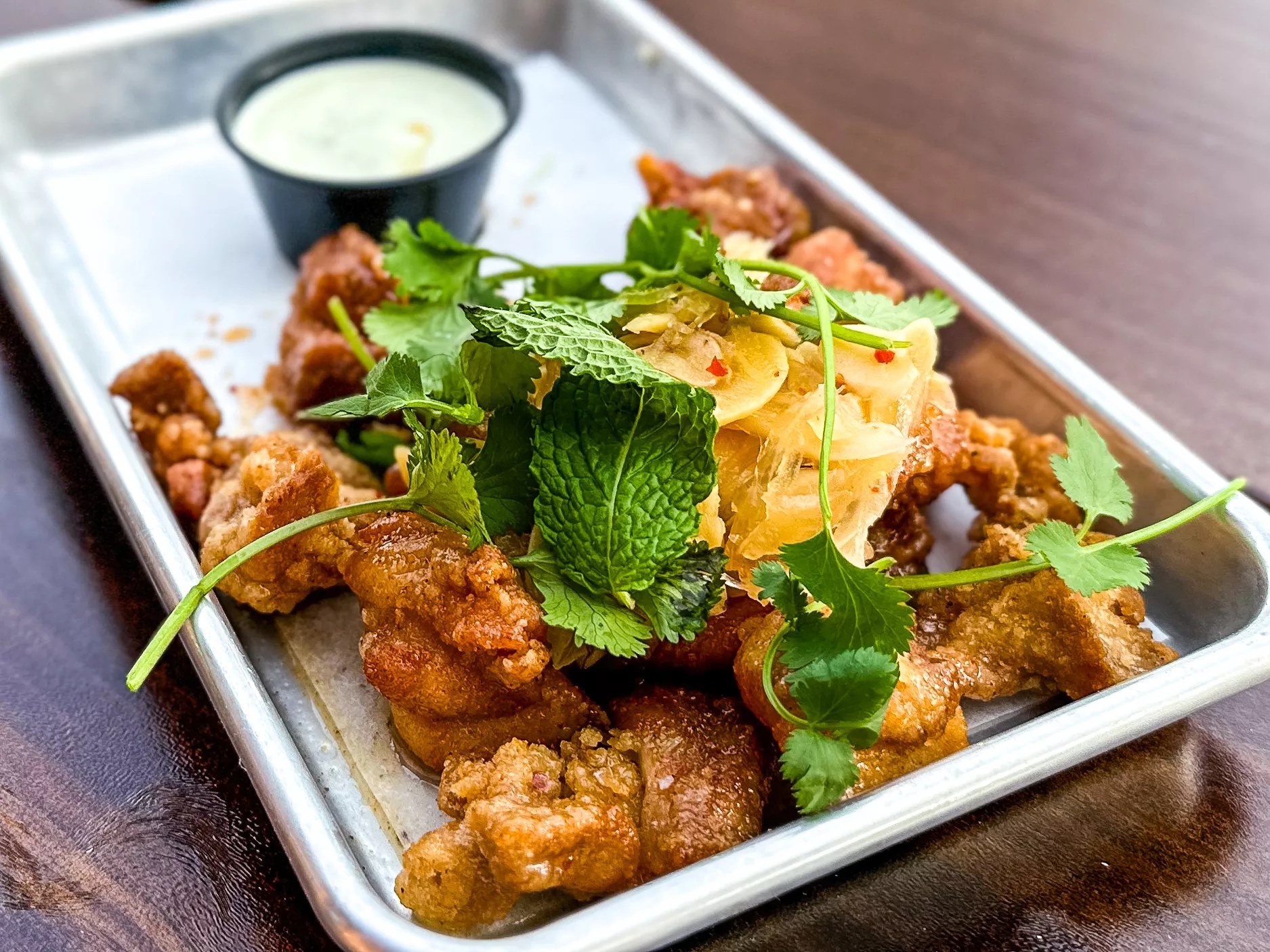 We started with the smoked salmon dip prepared with yuzu, Sriracha aioli and togarashi and served with crispy wonton chips. The dip was fine, though the citrus flavor from the yuzu was perhaps a bit too pronounced. The chips, however, were “dope,” according to the members of our gathering. Chicken karaage with chili aioli, Szechuan salt and Thai herbs. Hank Vaughn