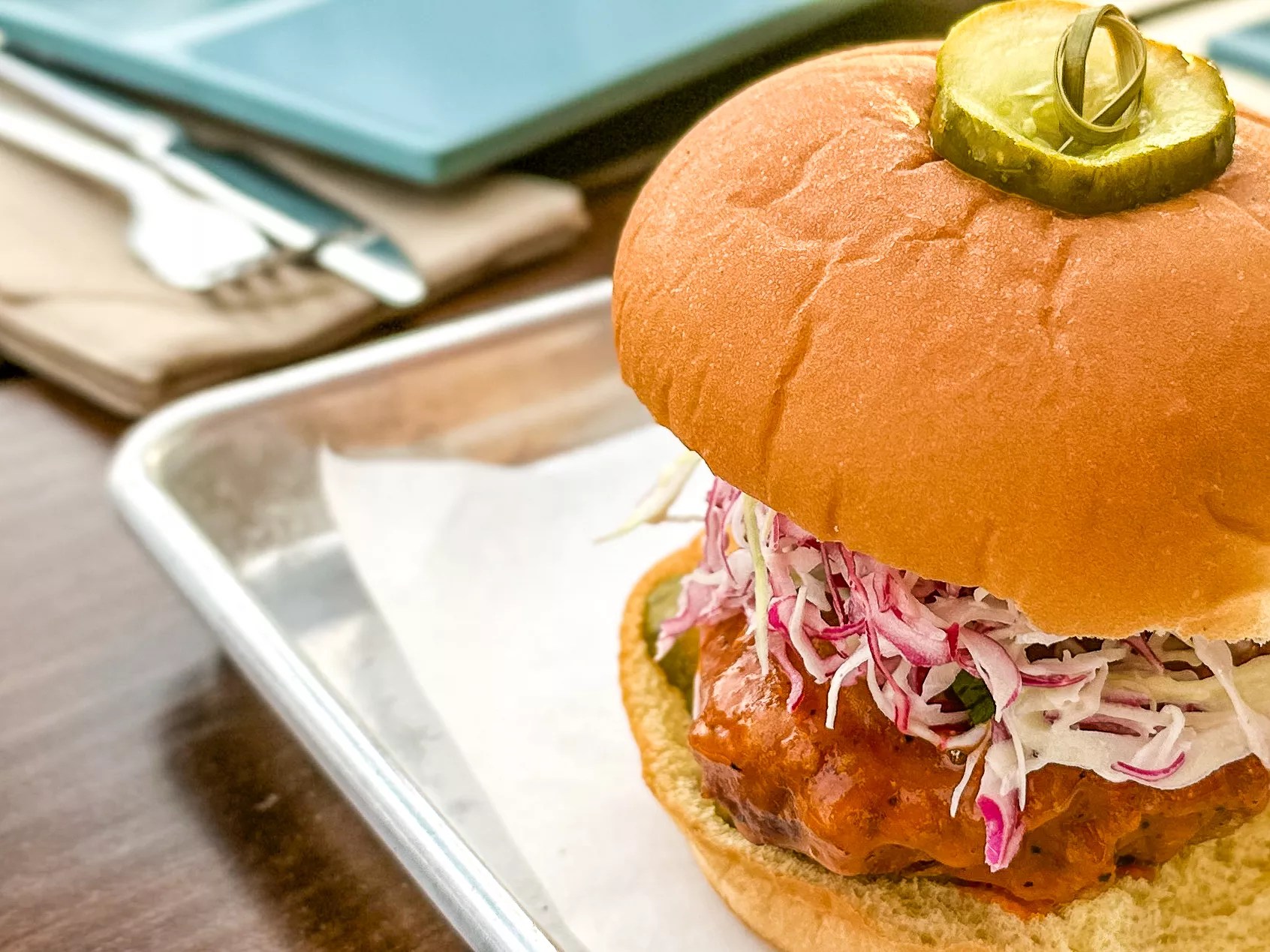 Crispy smoked chicken sandwich with spicy honey, citrus-cabbage slaw, and smoked hot sauce.