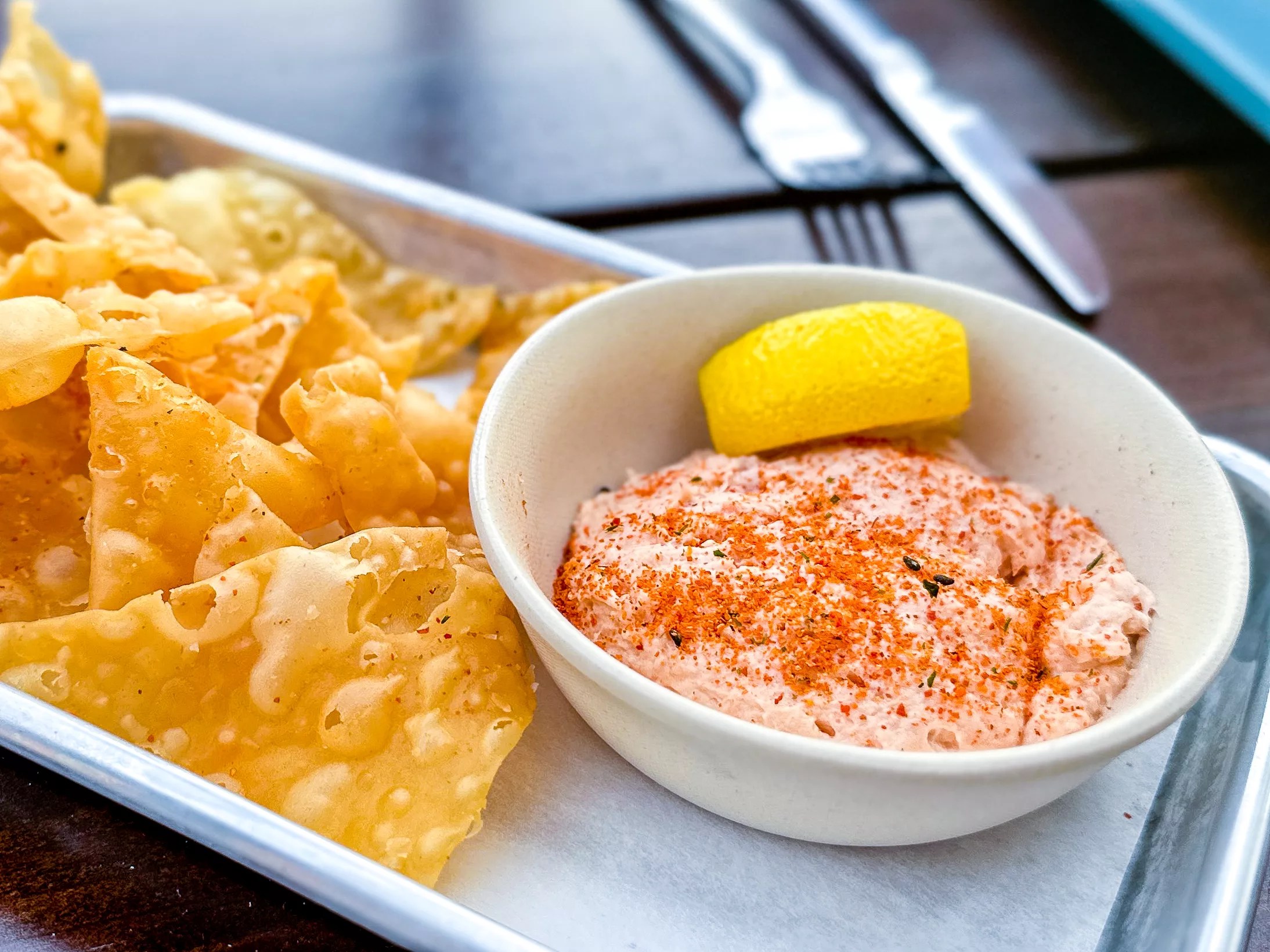 Smoked salmon dip and wonton chips.
