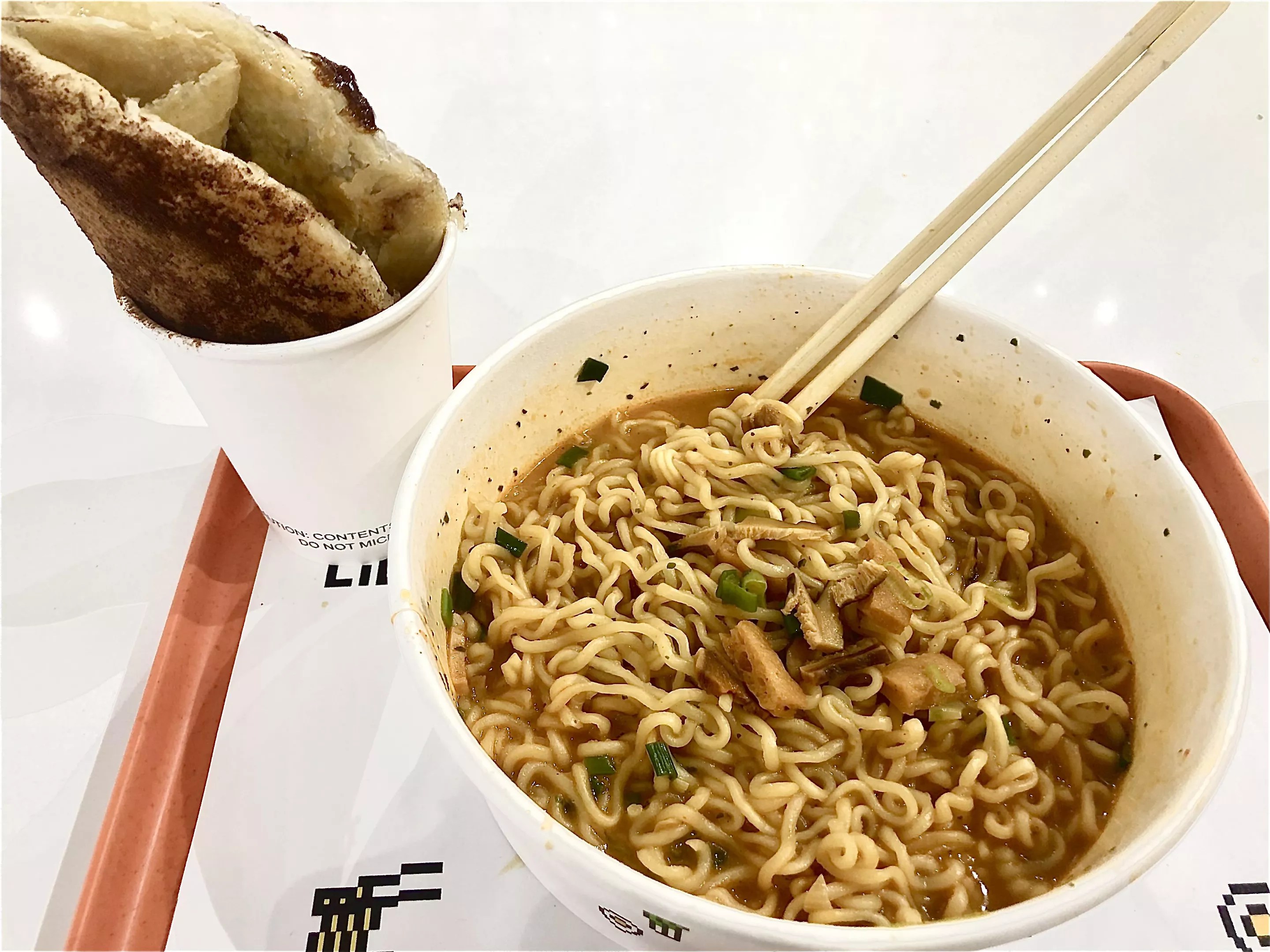 We went with Nongshim’s shin mushroom and fried tofu ramyun ($5.99) topped with green onions (an additional 99 cents) and Shin Gold chicken broth with a boiled egg and wood ear mushrooms. Before we checked out, the kiosk asked whether it could tempt us with lemonade or hodduk, a sweet, fried Korean pancake. It most certainly could. We added a cotton candy lemonade ($5.50) and cinnamon hodduk ($4.99) to our cart, checked out, and stood in line to wait for a pair of seats to open up.