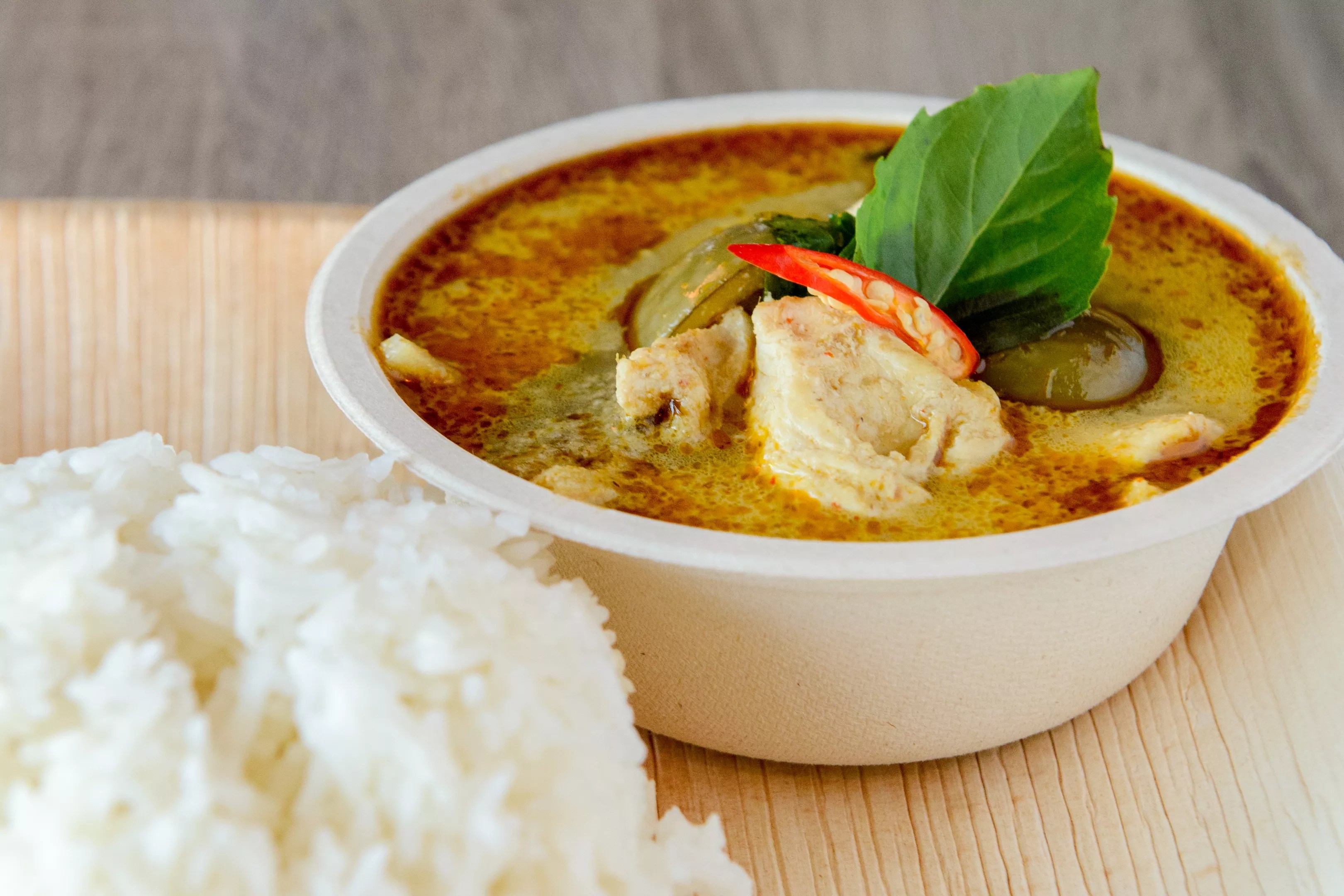 Another dish featuring big, bold flavor is the green curry ($12). It looks like a small bowl, and it’s served with a mound of rice that seems disproportionately big. But this curry is a feast for the senses: thin slices of small, round Thai eggplant, the aroma of Makrut lime leaves, tender chicken, a gentle current of spice.