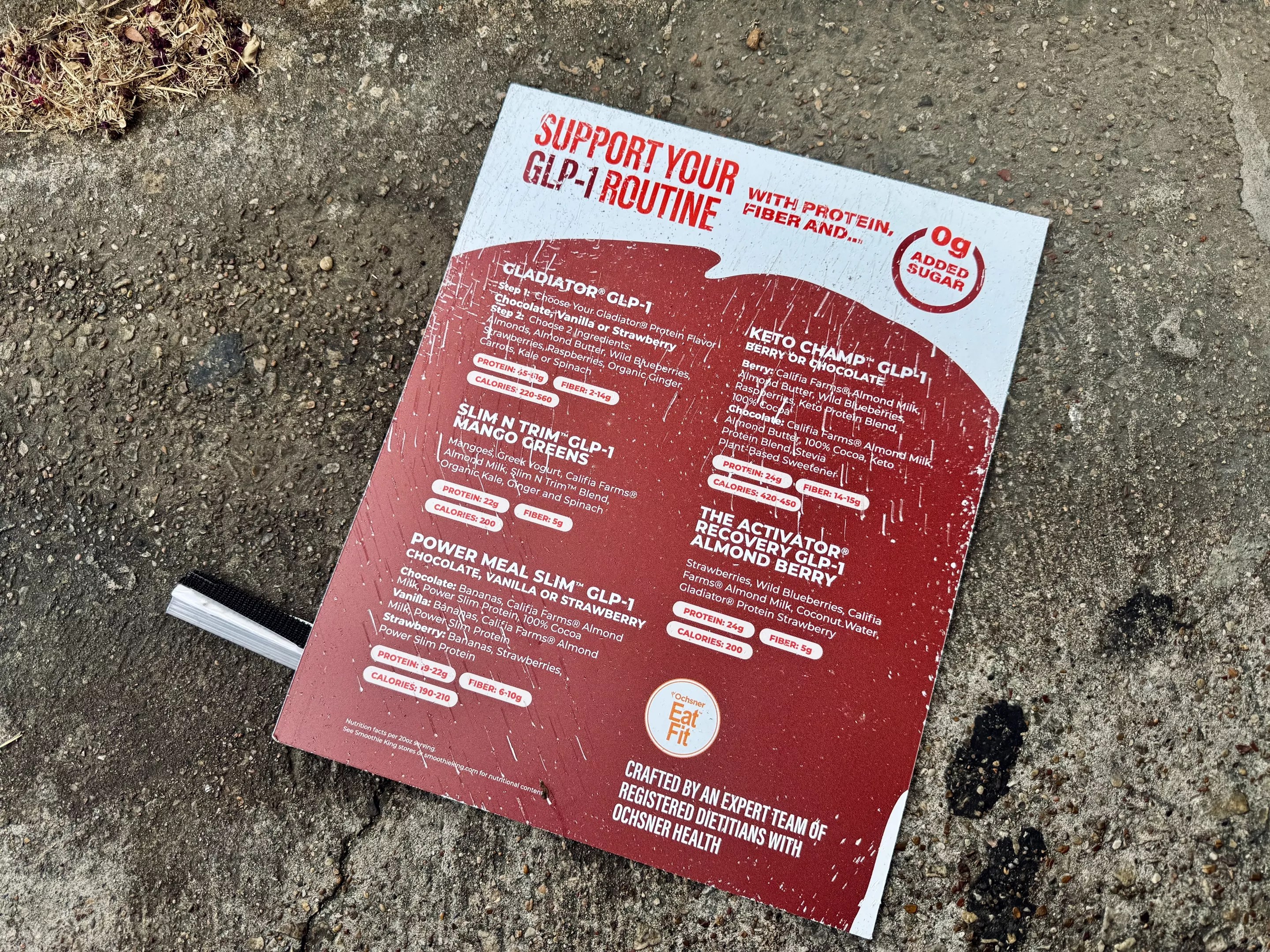 This new menu at a North Texas Smoothie King got carried away in the brisk winds on Tuesday afternoon and was lying face down in the drive-thru. A truly light menu.