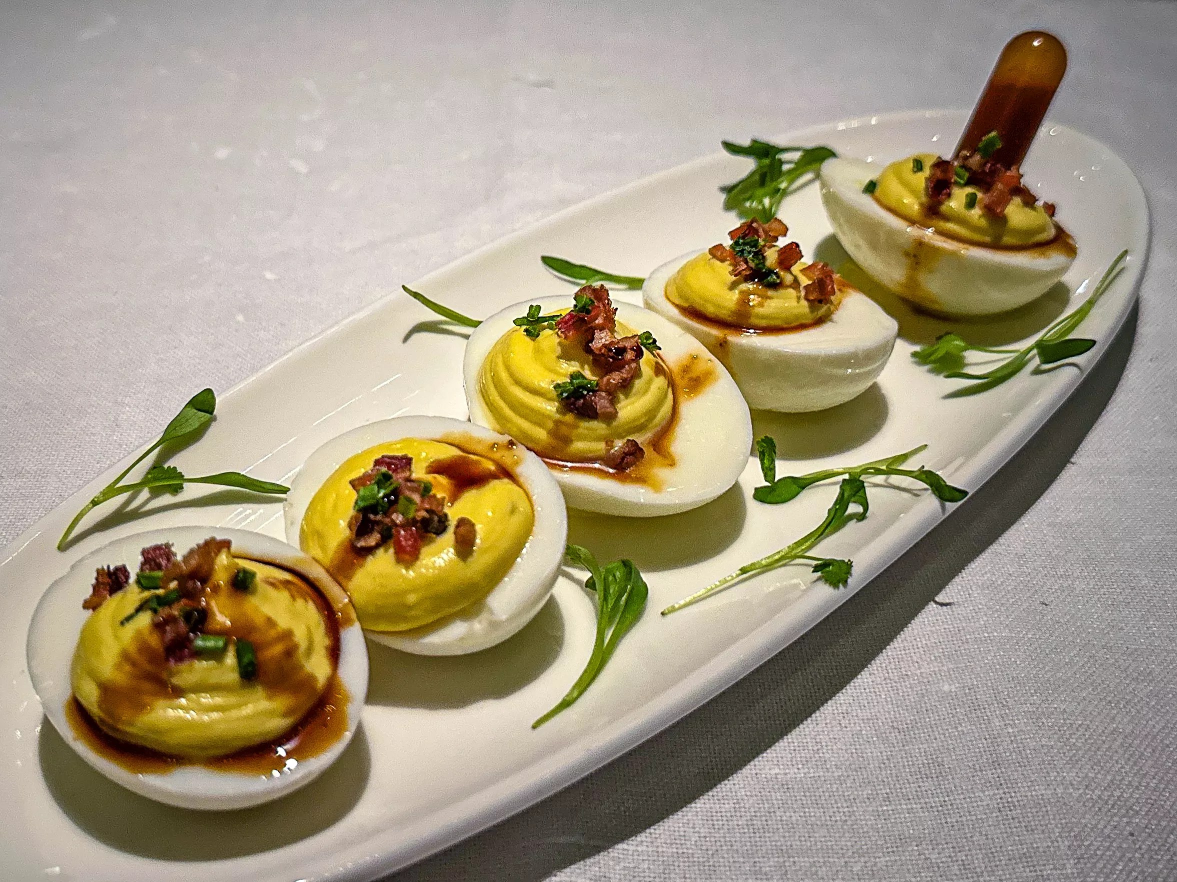 While we waited for the drinks to arrive the server brought us a loaf of wonderful onion bread along with softened butter. The bread was full of rich flavor and was baked in pull-apart sections, which we pulled apart. We would love to have eaten more, but we had a big meal ahead of us. Deviled eggs with candied bacon, chives and black garlic hot sauce. Hank Vaughn