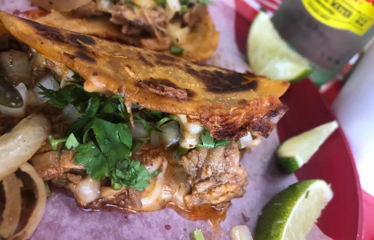 The construction of this taco is salacious. In broad terms, it’s like a tacos dorados, but doused and dipped in a beefy Mexican stew. A tortilla is placed on a griddle then Mendoza ladles beef broth over it, then covers it in cheese. That part alone is amazing. But that’s not all! The actual “birria” is slow-stewed beef magic, which is served in a bowl on the side. So, you dip your taco in the stew before you eat it. Chilangos has a video on their Instagram stories if you’d like to watch how it’s done.